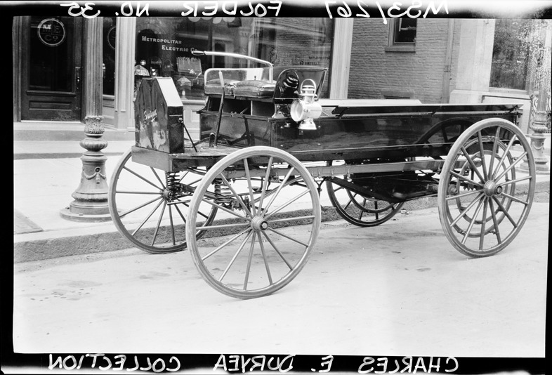 View of a 1908-1910 Duryea truck. Handwritten on negative: "Charles E. Duryea Collection." Typed on sleeve: "Subject: Duryea motor trucks. Collection: MS3/Charles E. Duryea Collection. Date: 1908-1910. Source: Estate of Charles E. & M. Jerry Duryea. I.D.: Duryea motor truck."