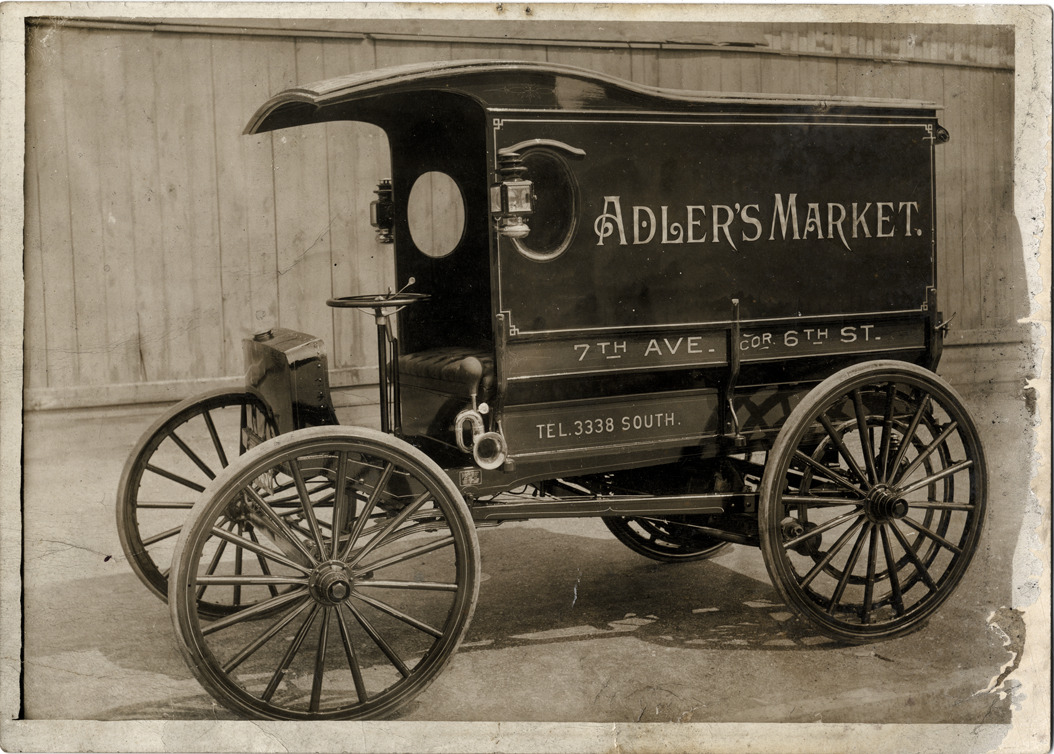 View of a 1915 Duryea truck, owned by Adler's Market. Painted on side of truck: "Adler's Market, 7th Ave., cor. 6th St., tel. 3338 South." Typed on back: "Subject: Duryea motor trucks. Collection: MS3/Charles E. Duryea Collection. Date: 1915. Source: Estate of Charles E. & M. Jerry Duryea. I.D.: Duryea motor trucks."