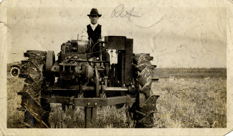View of a man driving a tractor that has a Duryea roller drive. Typed on back: "Subject: Farm tractor. Collection: MS3/Charles E. Duryea Collection. Date: 1923. Source: Estate of Charles E. & M. Jerry Duryea. I.D.: Duryea roller drive on light farm tractor (equipped with 'Old Reliable' 2 cylinder engines)."