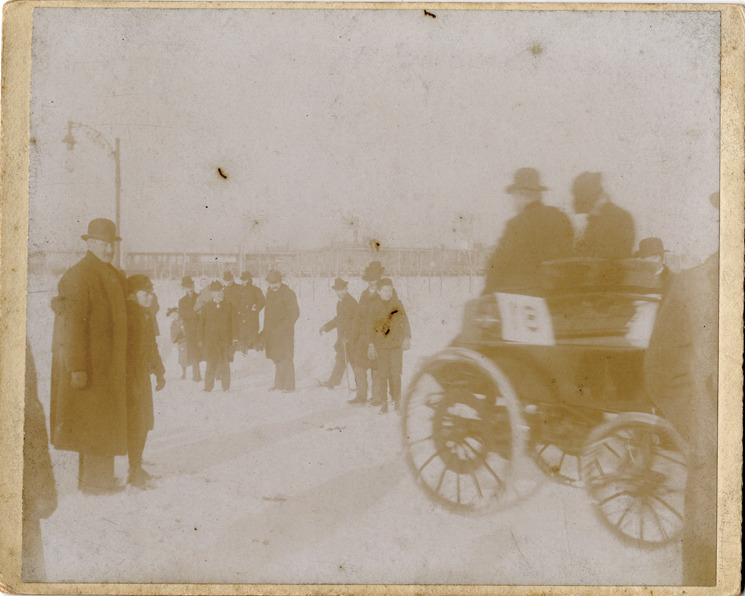View of Morris and Salom's Electrobat automobile at the start of the 1895 Chicago Times-Herald Race. Spectators in background. Typed on back: "Subject: Races & racing--Chicago Times Herald. Collection: MS3/Charles E. Duryea Collection. Date: Nov. 28, 1895. Source: Estate of Charles E. & M. Jerry Duryea. I.D.: Number eighteen, Morris and Salom, sponsor 926 Drexel Building, Philadelphia. Model: Electrobat. Pedro G. Salom, electrician. Seated in car: Henry Morris, mechanical engineer, and driver Hiram P. Maxim, umpire. Photo shows beginning of race running at 3 m.p.h." Advertisement for American Machinist magazine printed on back. Handwritten on back: "Morris & Salom, start Nov. 28, '95."