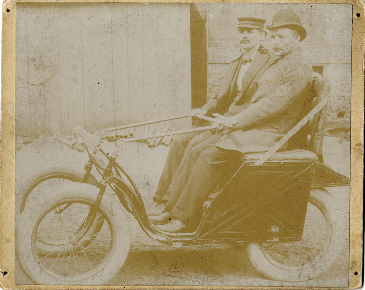 View of motorists posing in a Pennington victoria during the 1895 Chicago Times-Herald Race. Typed on back: "Subject: Races & racing--Chicago Times Herald. Collection: MS3/Charles E. Duryea Collection. Date: 1895. Source: Estate of Charles E. & M. Jerry Duryea. I.D.: E.J. Pennington Victoria, waith [sic] bicycle construction. Given short runs at Chicago, but never came to the starting line. Quote from Charles B. King in Dec. 1895 issue of magazine, The Motorcycle." Advertisement for American Machinist magazine printed on back. Handwritten on back: "Pennington."