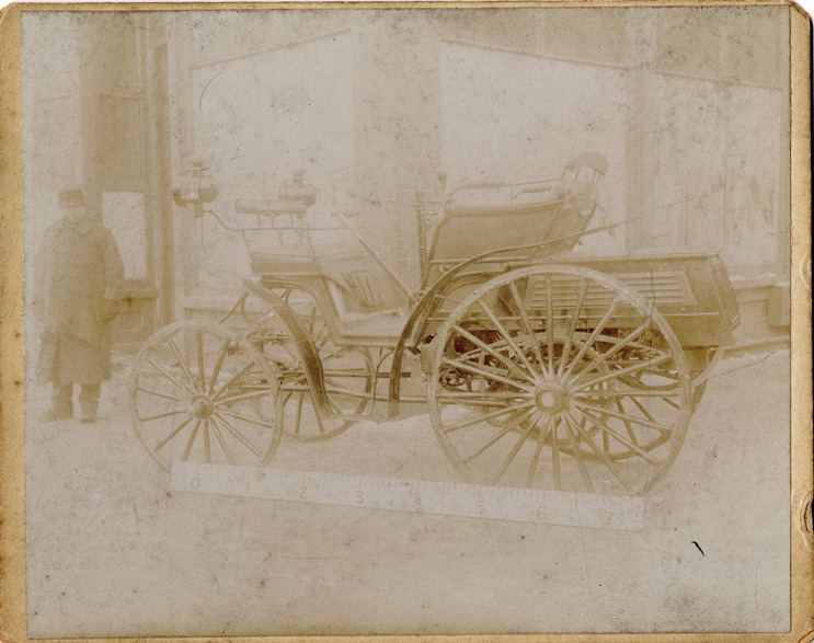 View of a Mueller-Benz automobile during the 1895 Chicago Times-Herald Race. Typed on back: "Subject: Races & racing--Chicago Times Herald. Collection: MS3/Charles E. Duryea Collection. Date: 1895. Source: Estate of Charles E. & M. Jerry Duryea. I.D.: Mueller-Benz." Advertisement for American Machinist magazine printed on back. Handwritten on back: "Mueller-Benz."