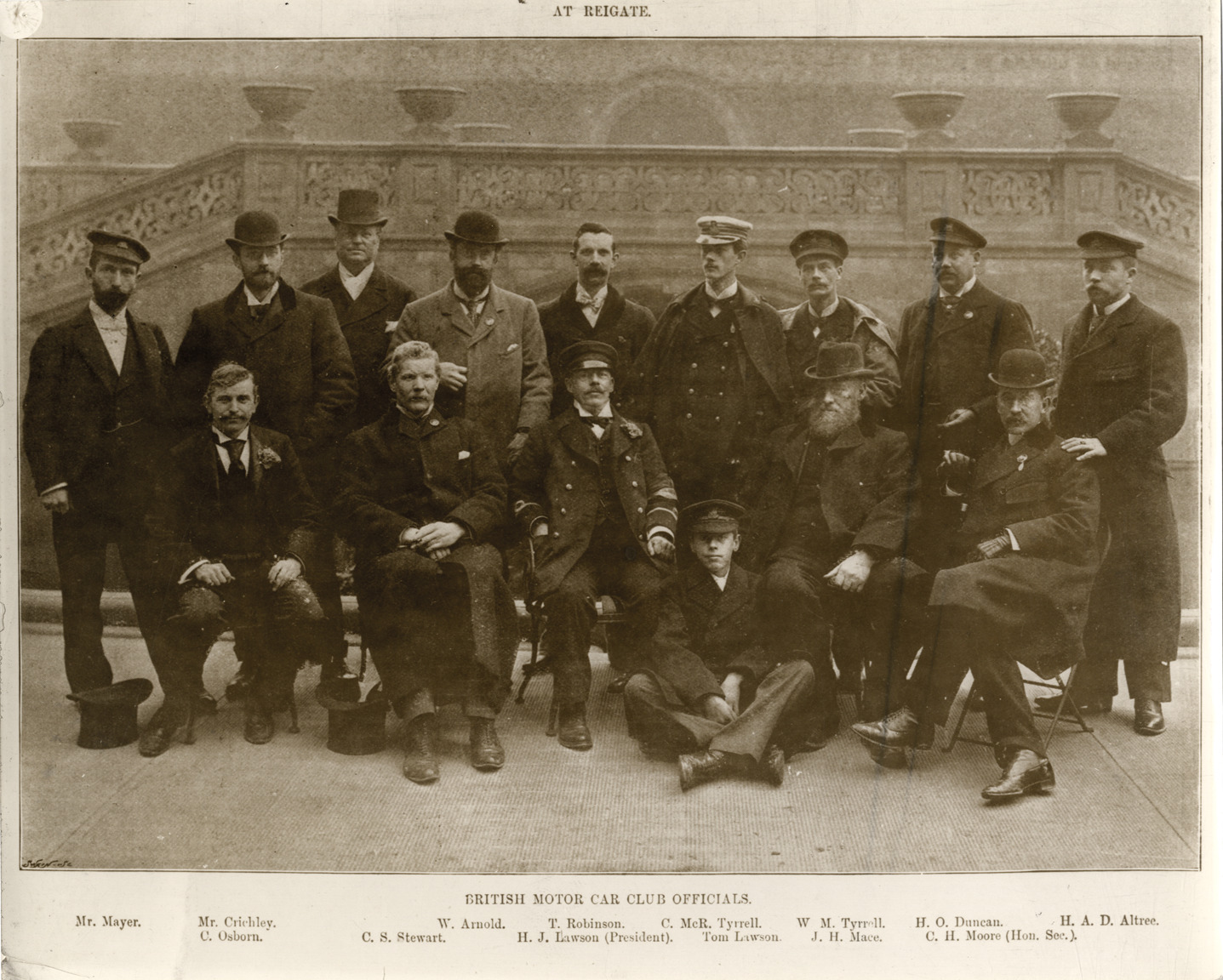Group portrait of British Motor Car Club officials at Reigate, England during the 1896 London to Brighton Veteran Car Run. Printed on front: "British Motor Car Club officials at Reigate. Mr. Mayer, Mr. Crichley, C. Osborn, C.S. Stewart, W. Arnold, H.J. Lawson (President), T. Robinson, C. McR. Tyrrell, Tom Lawson, W.M. Tyrrell, J.H. Mace, H.O. Duncan, C.H. Moore (Hon. Sec.), H.A.D. Altree." Typed on back: "Subject: Races & racing--London to Brighton. Collection: MS3/Charles E. Duryea Collection. Date: 1896. Source: Estate of Charles E. and M. Jerry Duryea. I.D.: British Motor Car Club officials." Stamped on back: "M.J. Duryea, 17 Farmington Avenue, Longmeadow, Mass." Facsimile signature on back: "Chas. E. Duryea." Handwritten on back: "Mayer, a consultant from German Daimler. Critchley."