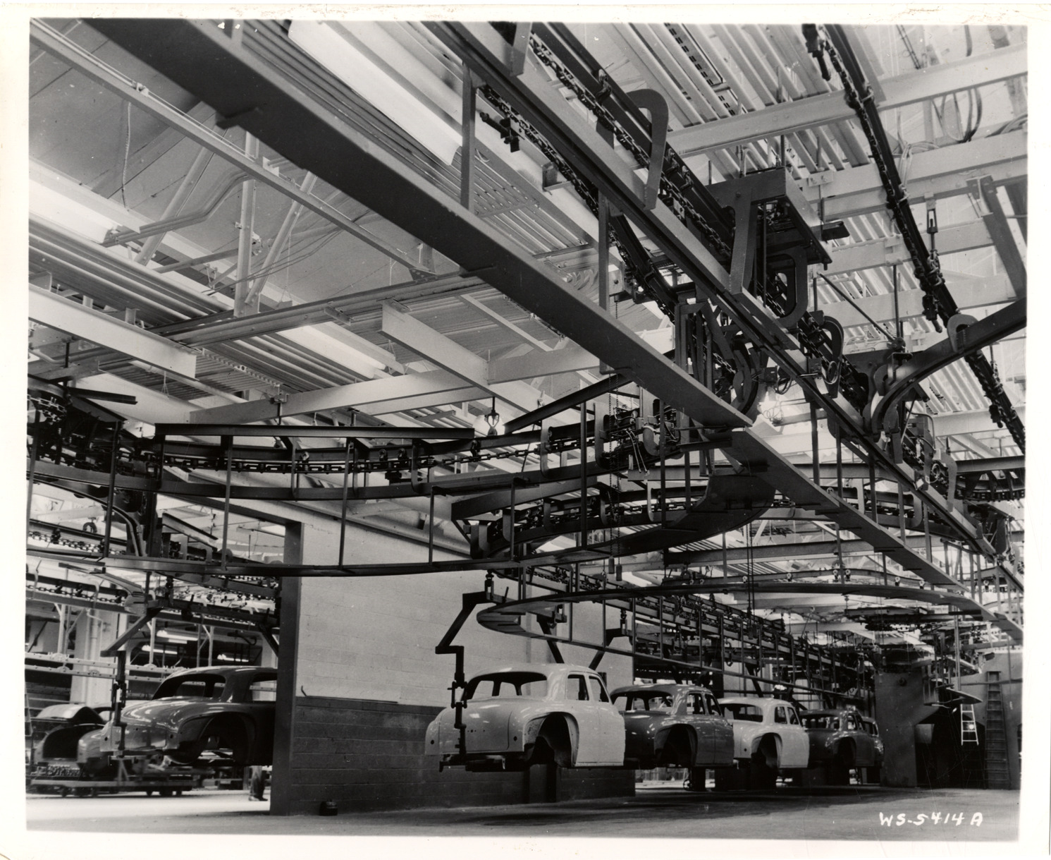 DeSoto automobile bodies on conveyors, DeSoto factory