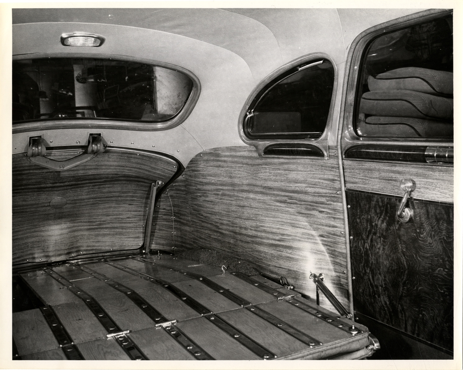 View of the interior of a DeSoto Suburban automobile. Label on back: "Another view of the DeSoto Suburban interior (on the assembly line), showing the use of Briggs decorative plastic panels. The wood grains fabricated into this plastic laminate are actual photographic reproductions. These plastic panels are durable and virtually scuff-proof. Surfaces may be waxed or polished without fear of deterioration. From: Briggs Manufacturing Co., Detroit." Handwritten on back: "Factories--DeSoto."