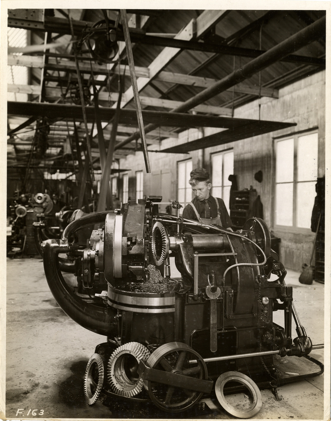 View of a man operating a milling machine at the Willys-Overland Company factory. Handwritten on back: "Factories--Overland, ca. 1909."