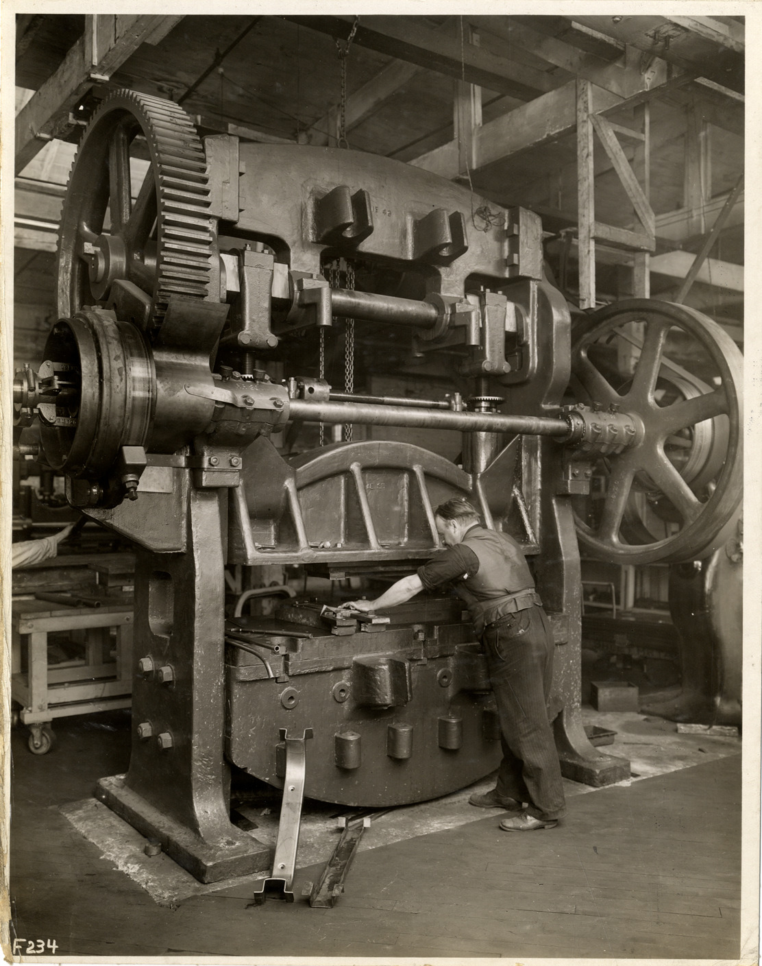 Favorite this☆ Worker operating machine, Willys-Overland Company factory Description: View of a man operating a machine at the Willys-Overland Company factory. Handwritten on back: "Factories--Overland, ca. 1909." Details Resource ID: na040787 Subject: Automobile factories Willys-Overland Company Automobile industry workers Machinery Photographic prints Date Issued: 1909 (year approximate) Format: 1 photographic print mounted on fabric ; 9.5 x 7.5 in. Member of: National Automotive History Collection Filing Location: Factories--Overland Rights: Physical rights are retained by DPL. Copyright is retained in accordance with U.S. copyright laws.