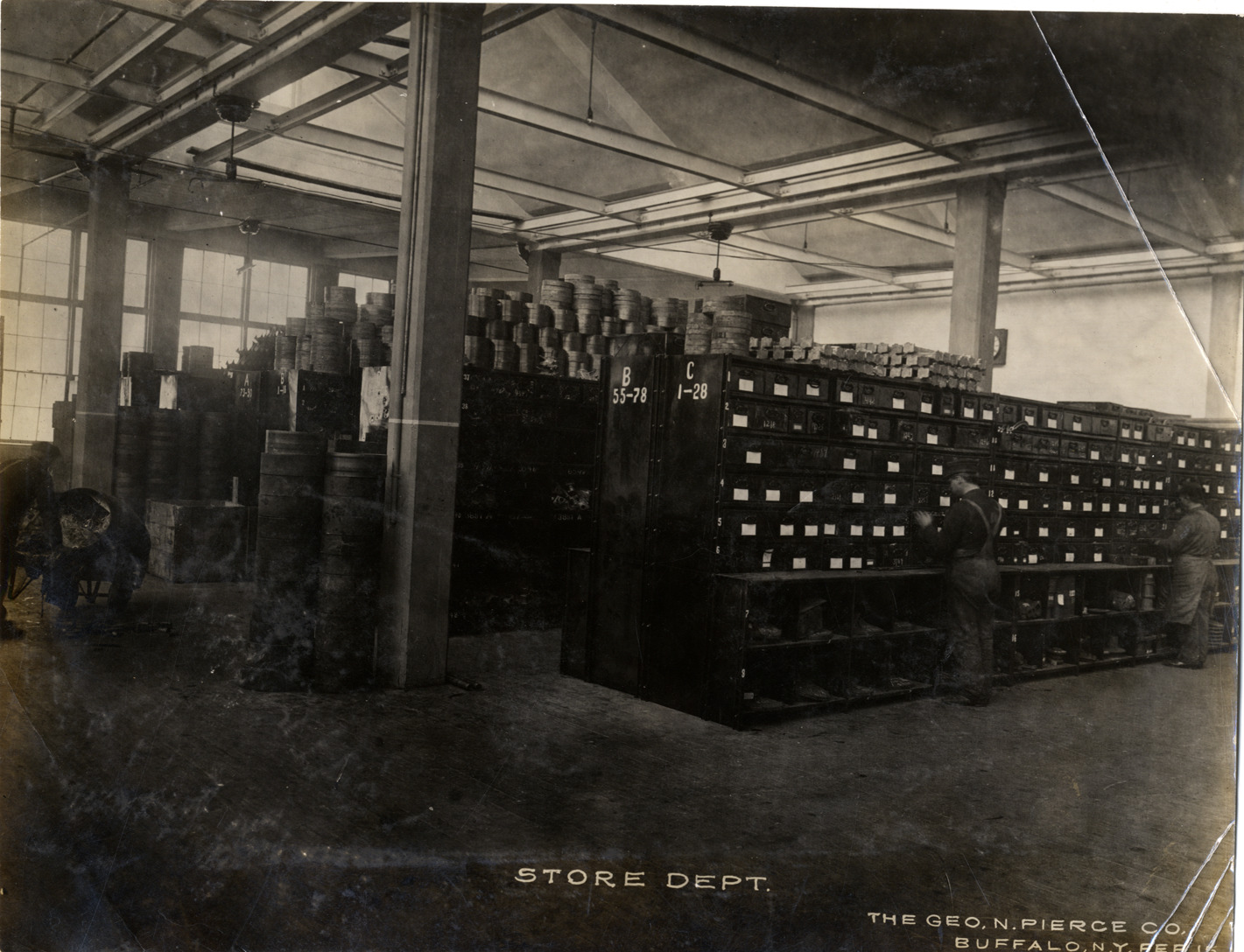 View of workers in the Store Department of the George N. Pierce Company factory in Buffalo, New York. Printed on front: "Store Dept. The Geo. N. Pierce Co., Buffalo, N.Y. Feb. 15." Handwritten on back: "Factories--Pierce, 1907."