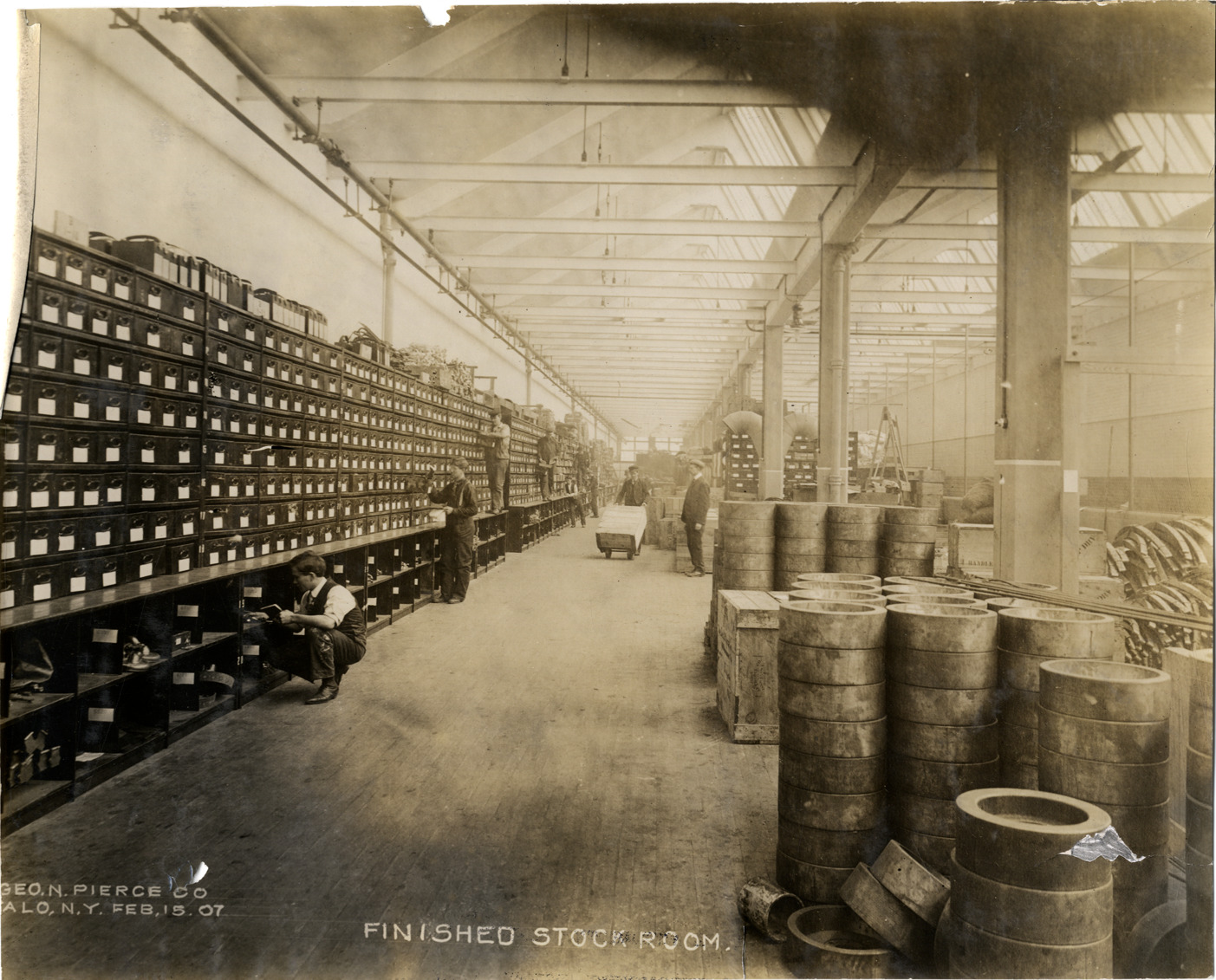 Favorite this☆ Stockroom, George N. Pierce Company factory Description: View of workers in the stockroom of the George N. Pierce Company factory in Buffalo, New York. Printed on front: "Finished stock room. The Geo. N. Pierce Co., Buffalo, N.Y., Feb. 15, 07." Handwritten on back: "Factories--Pierce, 1907." Details Resource ID: na040818 Subject: George N. Pierce Company Automobile factories--New York (State)--Buffalo Automobile industry workers--New York (State)--Buffalo Photographic prints Date Issued: 1907-02-15 Format: 1 photographic print ; 7.5 x 9.25 in. Member of: National Automotive History Collection Filing Location: Factories--Pierce Rights: Physical rights are retained by DPL. Copyright is retained in accordance with U.S. copyright laws.