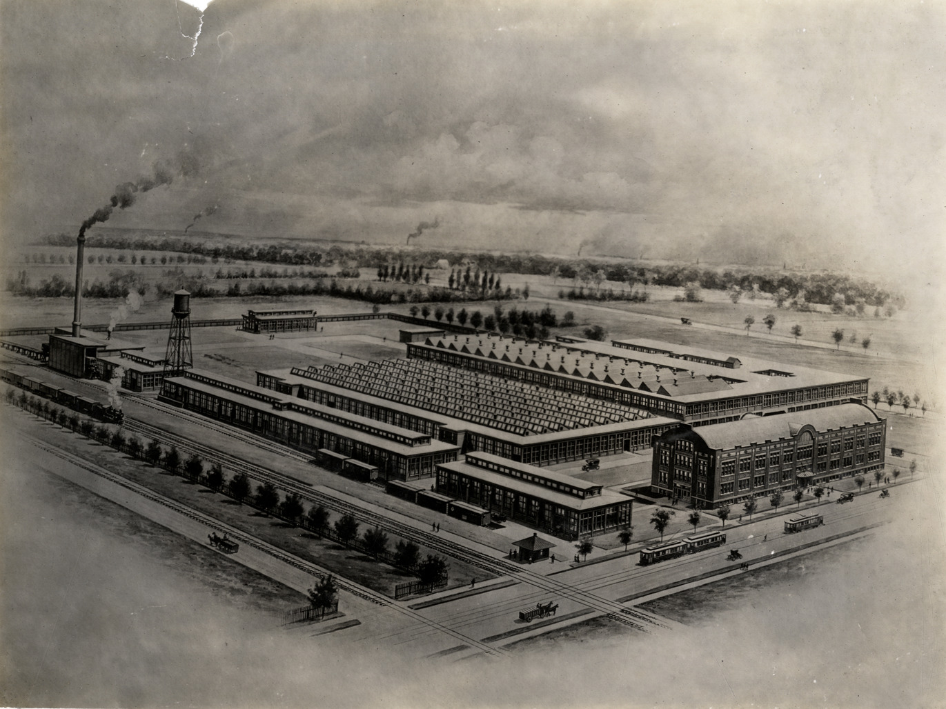 Favorite this☆ Pierce-Arrow Motor Car Company factory Description: Artist's depiction of the Pierce-Arrow Motor Car Company Company, Elmwood Avenue plant, in Buffalo, New York. Handwritten on back: "Pierce-Arrow Elmwood Av. factory, Buffalo, 1906." Details Resource ID: na040819 Subject: Pierce-Arrow Motor Car Company Automobile factories--New York (State)--Buffalo Photographic prints Date Issued: 1906 Format: 1 photographic print ; 7 x 9.25 in. Member of: National Automotive History Collection Filing Location: Factories--Pierce-Arrow Rights: Physical rights are retained by DPL. Copyright is retained in accordance with U.S. copyright laws.