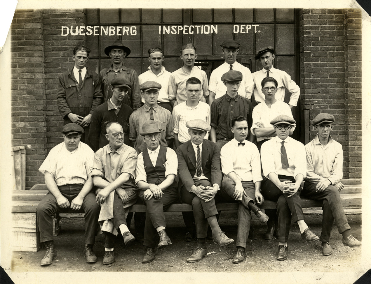 Favorite this☆ Duesenberg Inspection Department Description: Group portrait of men from the Duesenberg Motor Company Inspection Department. Printed on front: "Duesenberg Inspection Department." Handwritten on back: "Factories--Duesenberg." Details Resource ID: na040830 Subject: Automobile industry workers Duesenberg Motor Company Photographic prints Date Issued: Unknown year Format: 1 photographic print ; 6.5 x 8.5 in. Member of: National Automotive History Collection Filing Location: Factories--Duesenberg Rights: Physical rights are retained by DPL. Copyright is retained in accordance with U.S. copyright laws.