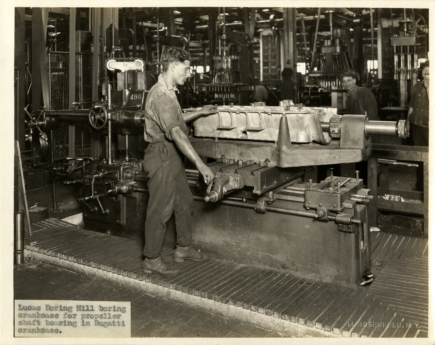 View of a man operating a Lucas boring mill at the Duesenberg Motor Company factory. Label on front: "Lucas boring mill boring crankcase for propeller shaft bearing in Bugatti crankcases." Embossed on front: "M. Rosenfeld, N.Y." Handwritten on back: "Factories--Duesenberg."