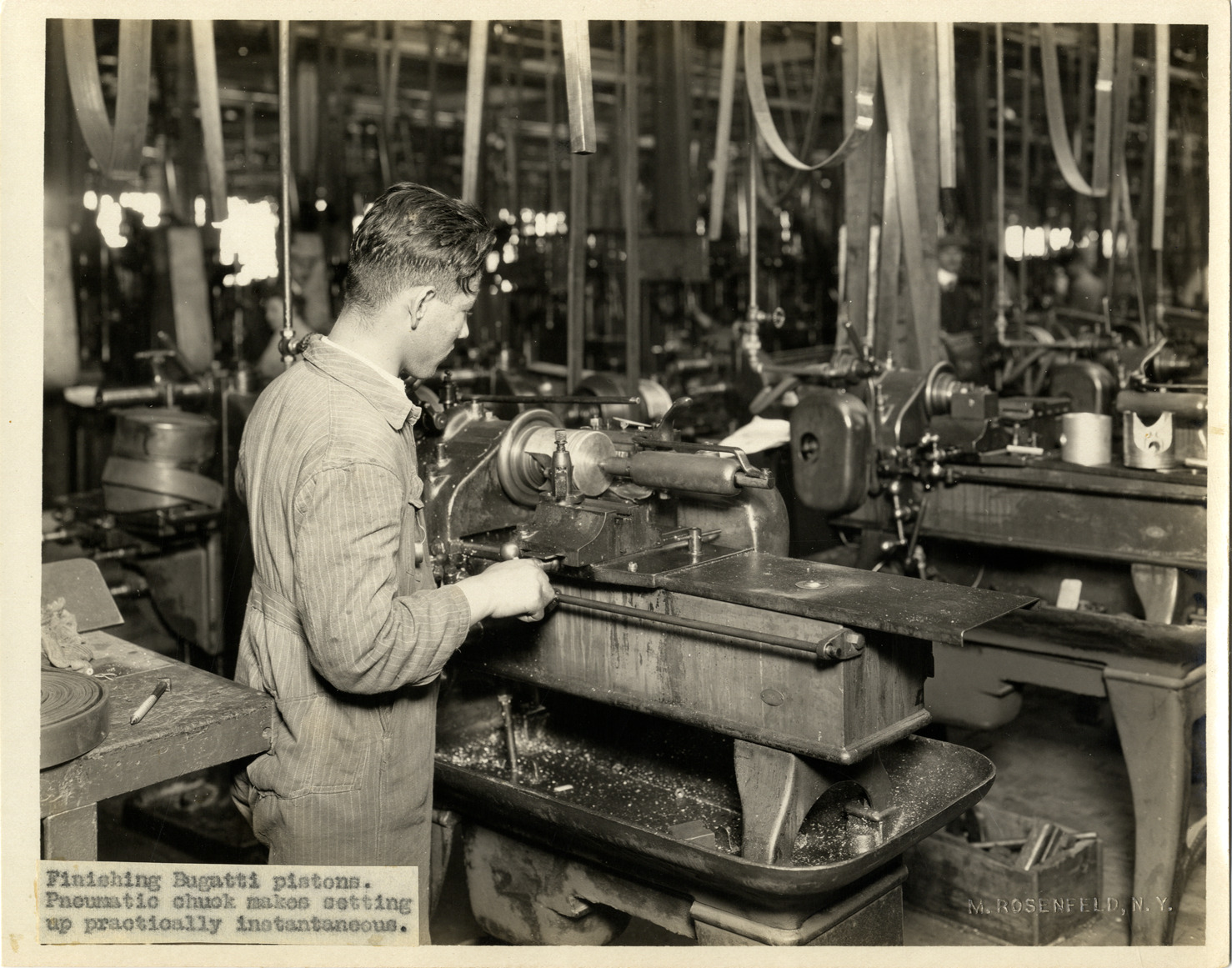 View of a man operating a machine with pneumatic chuck at the Duesenberg Motor Company factory. Label on front: "Finishing Bugatti pistons. Pneumatic chuck makes setting up practically instantaneous." Embossed on front: "M. Rosenfeld, N.Y." Handwritten on back: "Factories--Duesenberg."