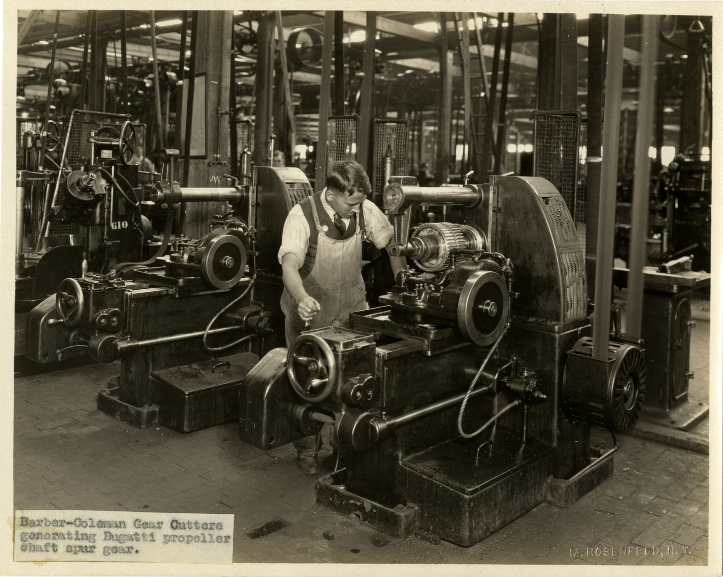 View of a man operating a Barber-Coleman gear cutting machine at the Duesenberg Motor Company factory. Label on front: "Barber-Coleman gear cutters generating Bugatti propeller shaft spur gear." Embossed on front: "M. Rosenfeld, N.Y." Handwritten on back: "Factories--Duesenberg."