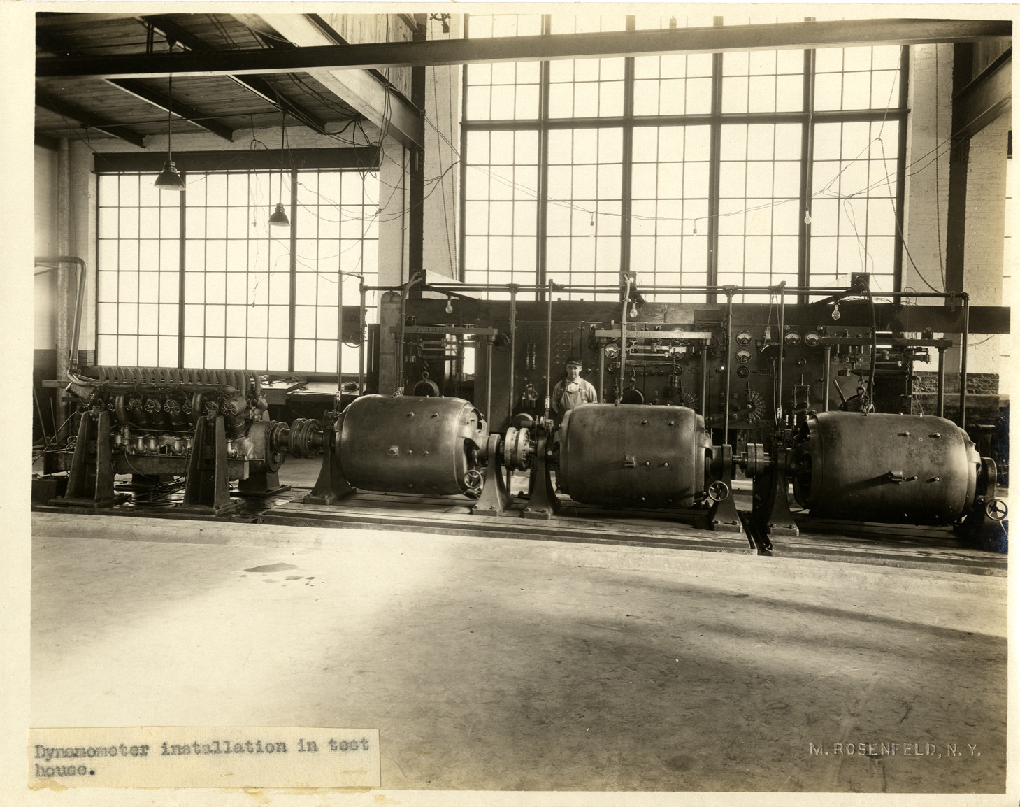View of a man posing with dynamometers in test house at the Duesenberg Motor Company factory. Label on front: "Dynamometer installation in test house." Embossed on front: "M. Rosenfeld, N.Y." Handwritten on back: "Factories--Duesenberg."