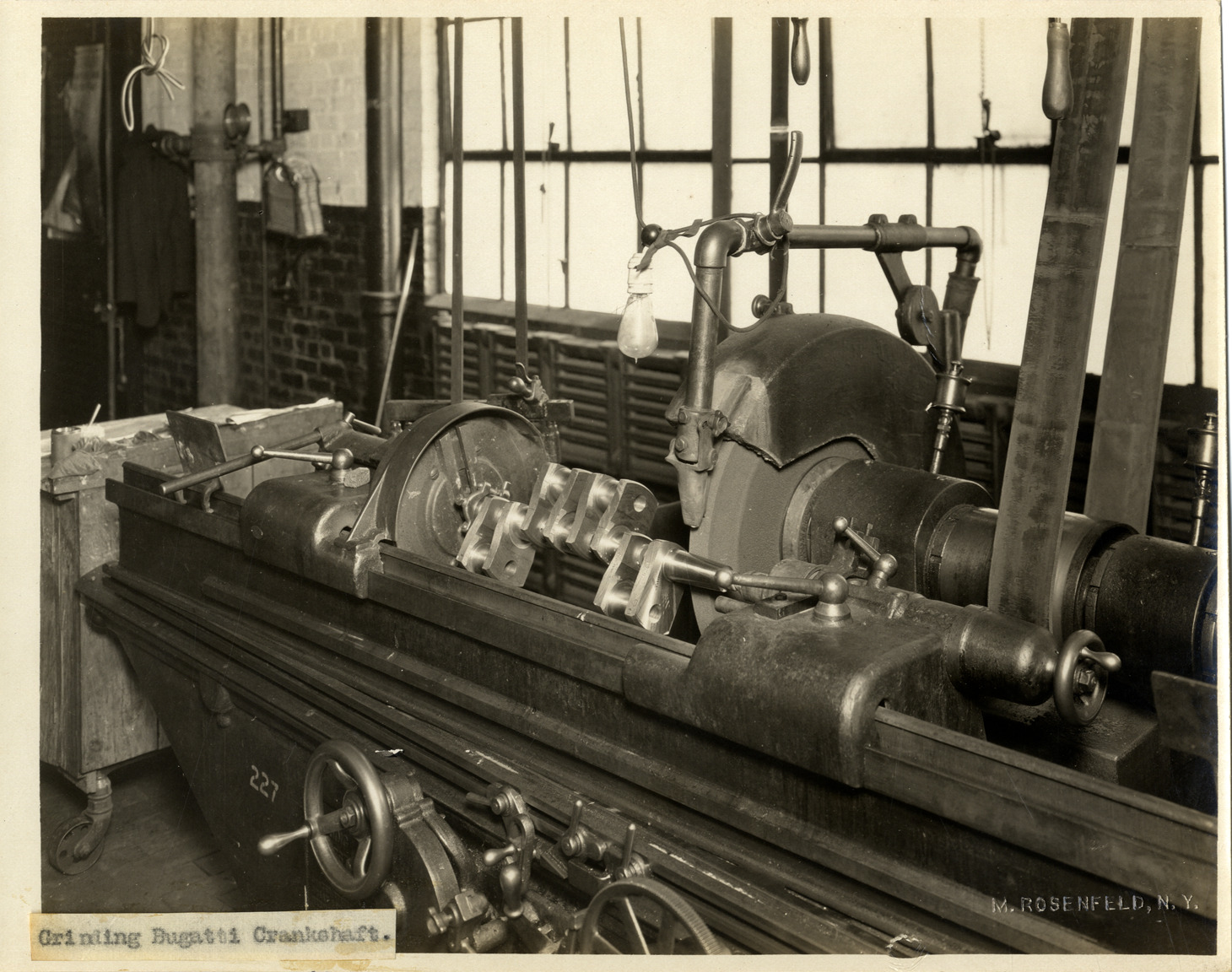 View of a Bugatti crankshaft on a grinding machine at the Duesenberg Motor Company factory. Label on front: "Grinding Bugatti crankshafts." Embossed on front: "M. Rosenfeld, N.Y." Handwritten on back: "Factories--Duesenberg."