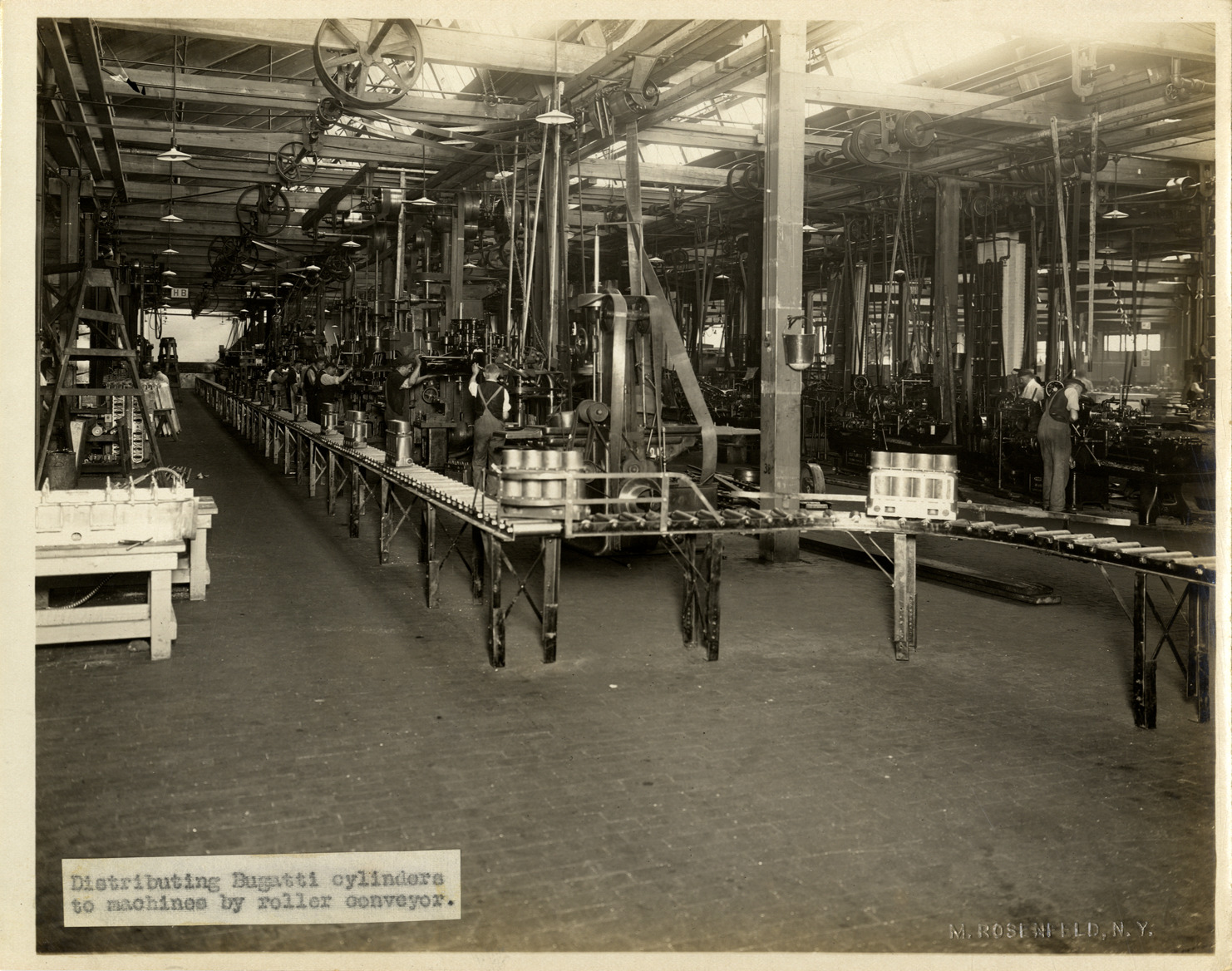 View of a Bugatti cylinders on a roller conveyor at the Duesenberg Motor Company factory. Label on front: "Distributing Bugatti cylinders to machines by roller conveyors." Embossed on front: "M. Rosenfeld, N.Y." Handwritten on back: "Factories--Duesenberg."