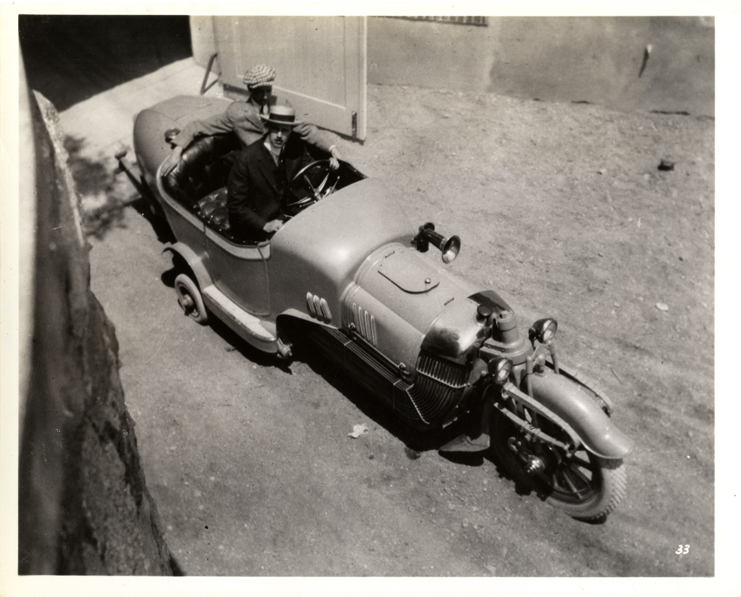 View of James Scripps Booth and passenger posing in a Bi-Autogo. The Bi-Autogo was an experimental car designed by Booth. Typed on back: "Subject: Bi-Autogo, 1912-1913. Collection: MS10/James Scripps Booth Collection. Date of photo: 1913. Location: Cranbook, Birmingham, Mich. Source: John M. Booth. I.D.: James S. Booth at wheel of Bi-Autogo, designed by James S. Booth 1908-1912, built 1912-1913. Bird's-eye view."