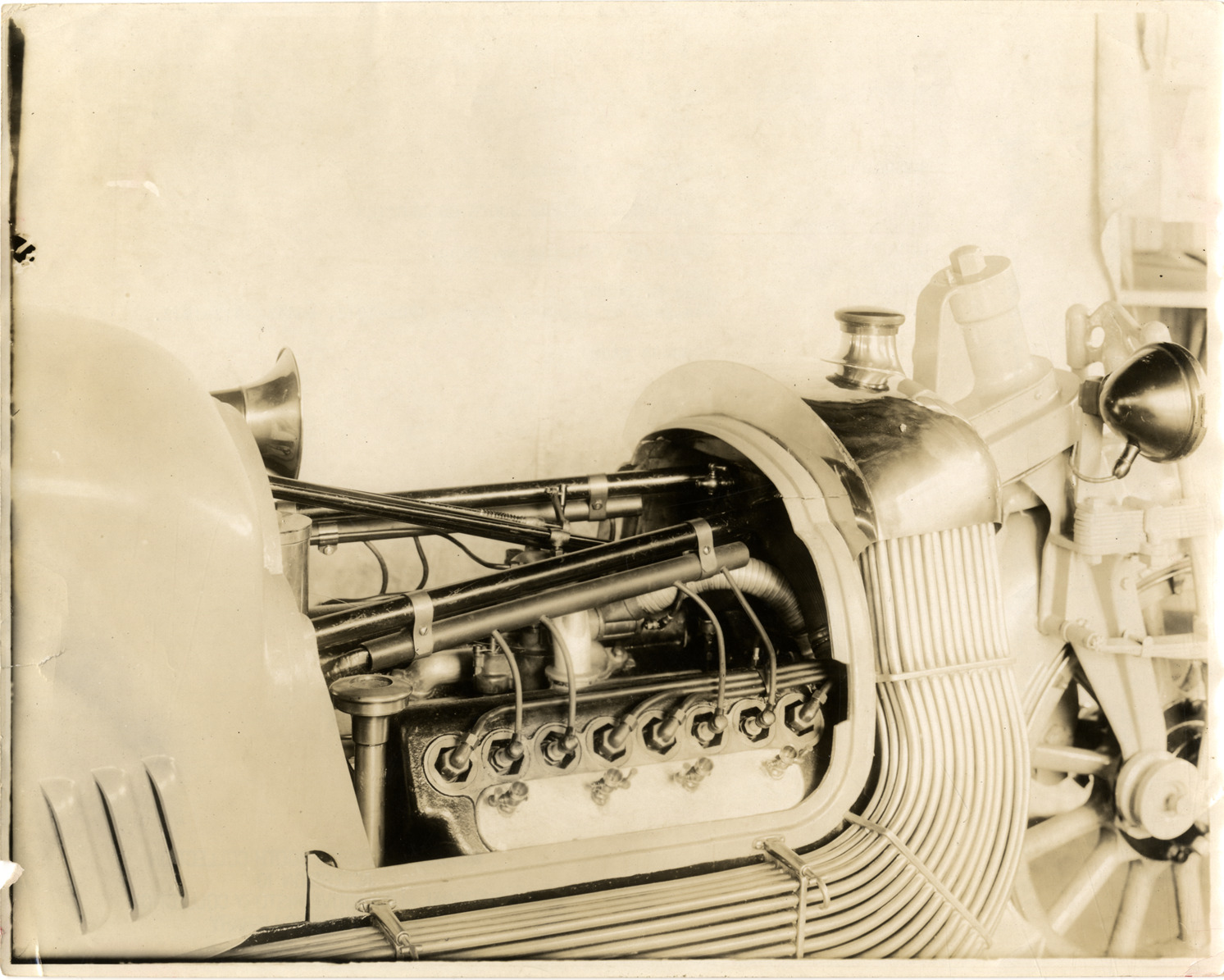 Close-up view of the engine of a Bi-Autogo, an experimental car designed by James Scripps Booth. Typed on back: "Subject: Bi-Autogo, 1912-1913. Collection: MS10/James Scripps Booth Collection. Date of photo: 1913. Location: Cranbook, Birmingham, Mich. Source: John M. Booth. I.D.: Designed by James S. Booth, 1908-1912, built 1912-1913. Engine view." Handwritten on back: "Two wheeled car designed and built by James S. Booth, 1912-13. Cranbrook, Birmingham, Mich."