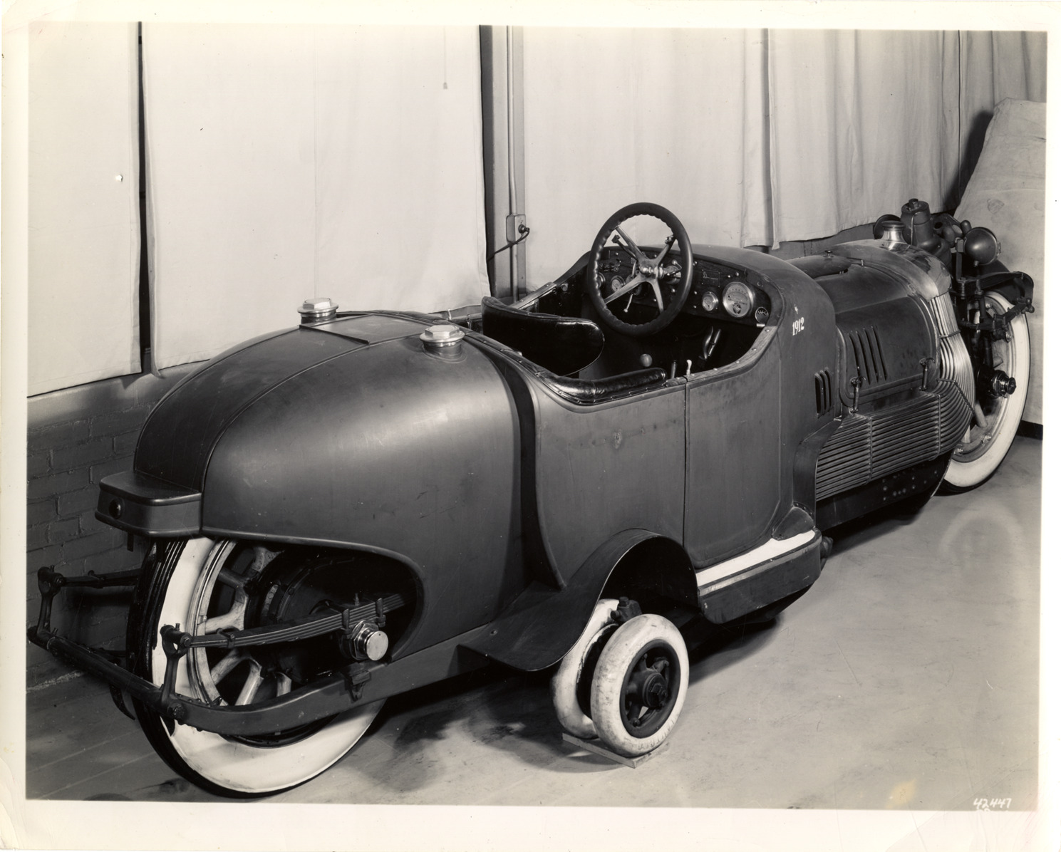View of a Bi-Autogo, an experimental car designed by James Scripps Booth. Typed on back: "Subject: Bi-Autogo, 1912-1913. Collection: MS10/James Scripps Booth Collection. Date of photo: c.1935. Location: Detroit, Mich. (at Terminal Avenue shop). Source: John M. Booth. I.D.: Designed by James S. Booth, 1908-1912, built 1912-1913. Three-quarter right rear, at Terminal Ave." Handwritten on back: "Two wheeled car designed and built by James S. Booth, 1912-13."