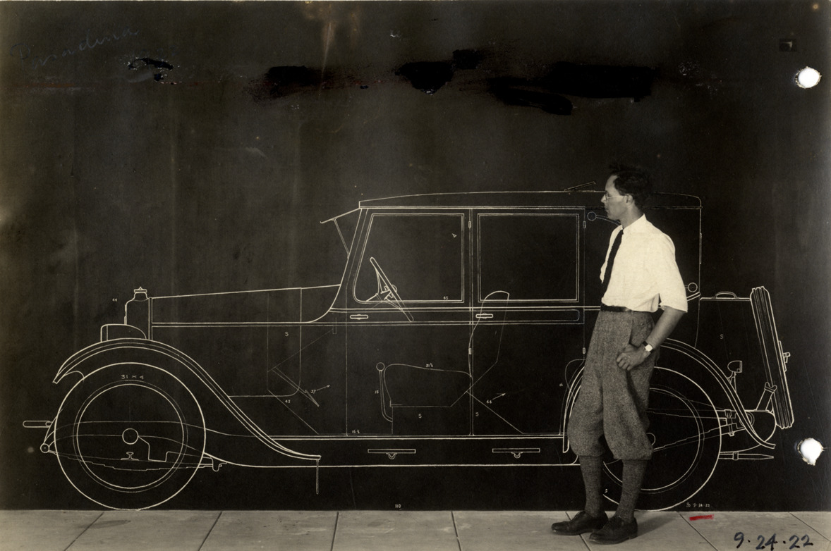 View of James Scripps Booth posing with a full-size drawing of the Da Vinci automobile. Typed on back: "Subject: Da Vinci, 1922 design. Collection: MS10/James Scripps Booth Collection. Date: 1922. Location: El Molino House, Pasadena, Calif. Photographer: Harold A. Parker, 200 East Colorado St., Pasadena, Calif. Source: John M. Booth. I.D.: Full size sketch on garage wall, designed and drawn by James S. Booth, shown in photograph." Handwritten on back: "Pasadena, 1922. J.S.B. with new car design."