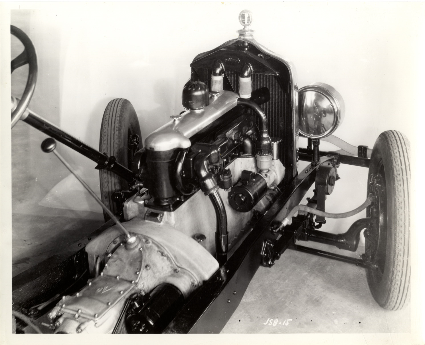 Close-up view of a Da Vinci automobile chassis, designed by James Scripps Booth, showing engine. Typed on back: "Subject: Da Vinci automobile, 1925. Collection: MS10/James Scripps Booth Collection. Date: 1925. Location: Detroit, Mich. Source: John M. Booth. I.D.: Da Vinci chassis detail, designed and built by James S. Booth. Da Vinci chassis and engine detail."