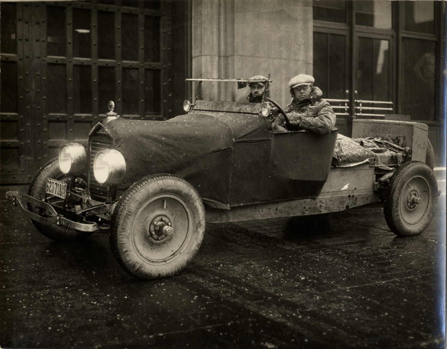 View of James S. Booth and Mr. Burton posing in a Da Vinci automobile, designed by James Scripps Booth. Typed on back: "Subject: Da Vinci automobile, 1925. Collection: MS10/James Scripps Booth Collection. Date: 1925. Location: Detroit? On way to Fleetwood, Pa. Source: John M. Booth. I.D.: Chassis with canvas cover, on way to Fleetwood, Pa. for installation of body. Car designed and built by James S. Booth. Driver: James S. Booth. Passenger: Mr. Burton. Three-quarter left front view, JSB at wheel)."