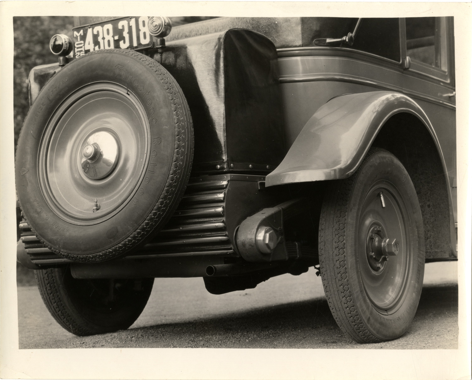 Close-up rear view of a Da Vinci automobile with closed Fleetwood body, designed by James Scripps Booth. Typed on back: "Subject: Da Vinci automobile, 1925. Collection: MS10/James Scripps Booth Collection. Date: 1926. Location: Belle Isle, Detroit, Mich. Photographer: Spencer & Wyckoff, photographers, Detroit, Mich. Source: John M. Booth. I.D.: Da Vinci with closed Fleetwood body. At Belle Isle, rear body detail." Stamped on back: "Spencer & Wyckoff, photographers, Detroit."