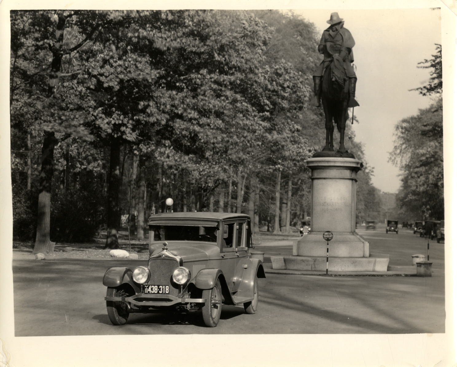View of James Scripps Booth driving a Da Vinci automobile with closed Fleetwood body on Belle Isle. Car was designed by James Scripps Booth. Statue of Major General Alpheus Starkey Williams in background. Typed on back: "Subject: Da Vinci automobile, 1925. Collection: MS10/James Scripps Booth Collection. Date: 1926. Location: Belle Isle, Detroit, Mich. Photographer: Spencer & Wyckoff, photographers, Detroit, Mich. Source: John M. Booth. I.D.: Da Vinci with closed Fleetwood body. James S. Booth at wheel. At Belle Isle at memorial statue." Stamped on back: "Spencer & Wyckoff, photographers, Detroit."