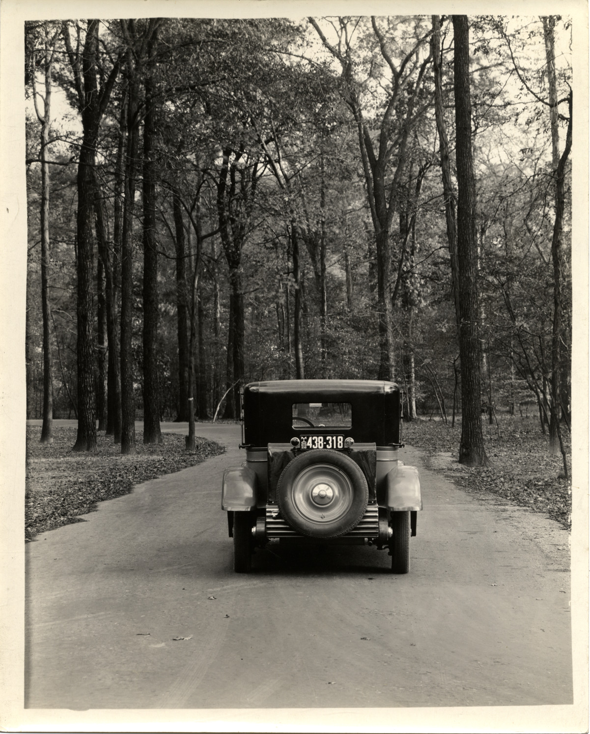 Rear view of a Da Vinci automobile with closed Fleetwood body on Belle Isle. Car was designed by James Scripps Booth. Typed on back: "Subject: Da Vinci automobile, 1925. Collection: MS10/James Scripps Booth Collection. Date: 1926. Location: Belle Isle, Detroit, Mich. Photographer: Spencer & Wyckoff, photographers, Detroit, Mich. Source: John M. Booth. I.D.: Da Vinci with closed Fleetwood body. At Belle Isle, rear view." Stamped on back: "Spencer & Wyckoff, photographers, Detroit."
