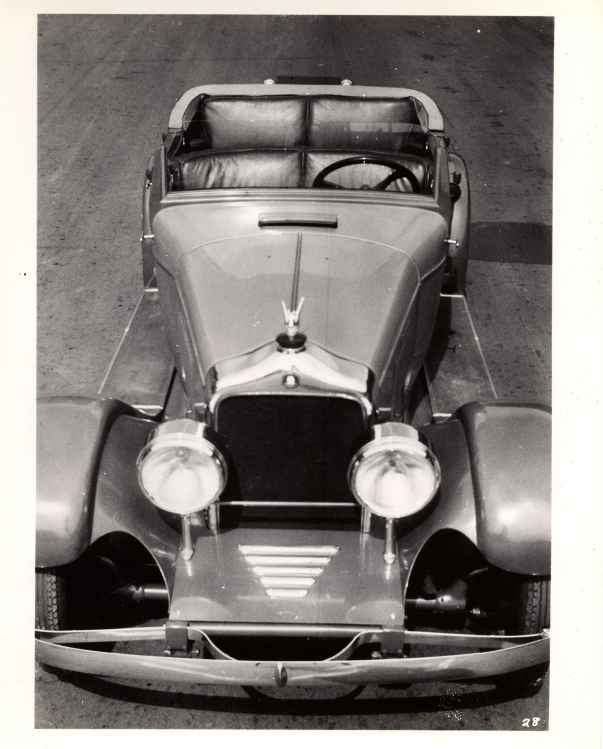 View of a Da Vinci automobile with open Fleetwood body. Car was designed by James Scripps Booth. Typed on back: "Subject: Da Vinci automobile, 1925. Collection: MS10/James Scripps Booth Collection. Date: 1934. Location: Detroit, Mich. (at Terminal Avenue shop?) Source: John M. Booth. I.D.: Da Vinci with Fleetwood open body. Although the license plate carries 1926 date, other photos of the Da Vinci 'Pup' showing John M. Booth in photo, places this photo date as 1934. Body detailing and chassis detailing are different than the original 1925 version of the car. (Photo #MS10/88, folder 9, shows both cars). Da Vinci as open car, bird's eye front view."