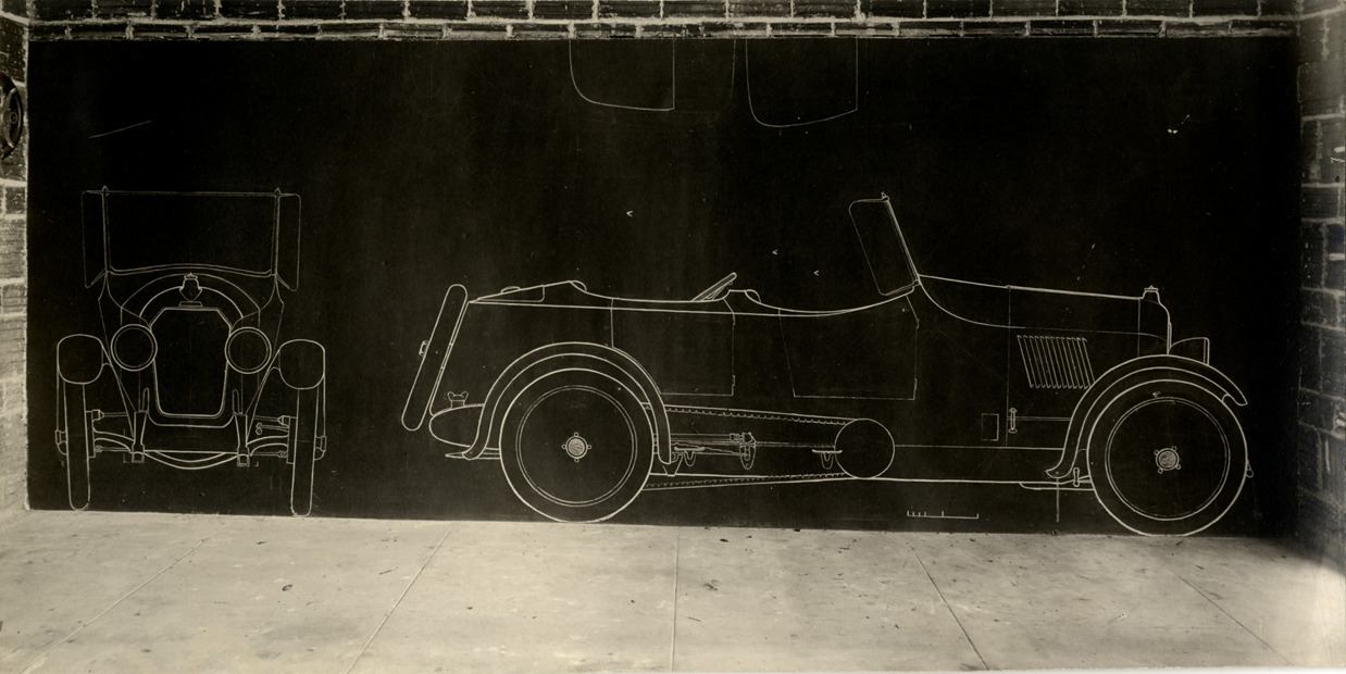 Life-size drawing of a Da Vinci "Pup" cyclecar, designed by James Scripps Booth. Typed on back: "Subject: Da Vinci 'Pup,' 1921 design. Collection: MS10/James Scripps Booth Collection. Date: 1921. Location: El Molino house, Pasadena, Calif. Photographer: Harold A. Parker, 200 East Colorado St., Pasadena, Calif. Source: John M. Booth. I.D.: Life size sketch of Da Vinci 'Pup' cyclecar on garage wall." Stamped on back: "Photographed by Harold A. Parker, 200 East Colorado Street, Pasadena, California." Handwritten on back: "California blackboard, 'Autocycle' cyclecar, JSB design, El Molino garage, 1921."