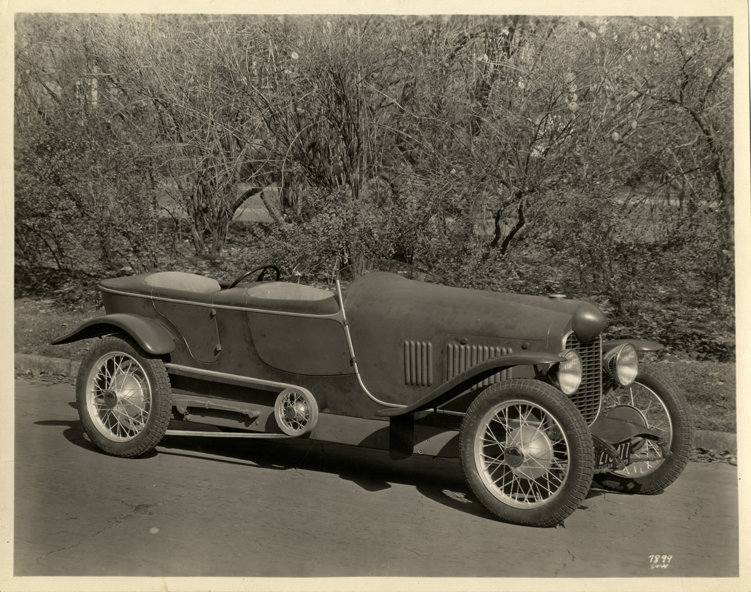 View of a Da Vinci "Pup" cyclecar, designed by James Scripps Booth. Typed on back: "Subject: Da Vinci 'Pup,' 1929. Collection: MS10/James Scripps Booth Collection. Date: 1929. Location: Indian Village, Detroit, Mich. Photographer: Spencer & Wyckoff, photographers, Detroit, Mich. Source: John M. Booth. I.D.: Designed 1921 by James S. Booth, built 1929. Three-quarter right front view."
