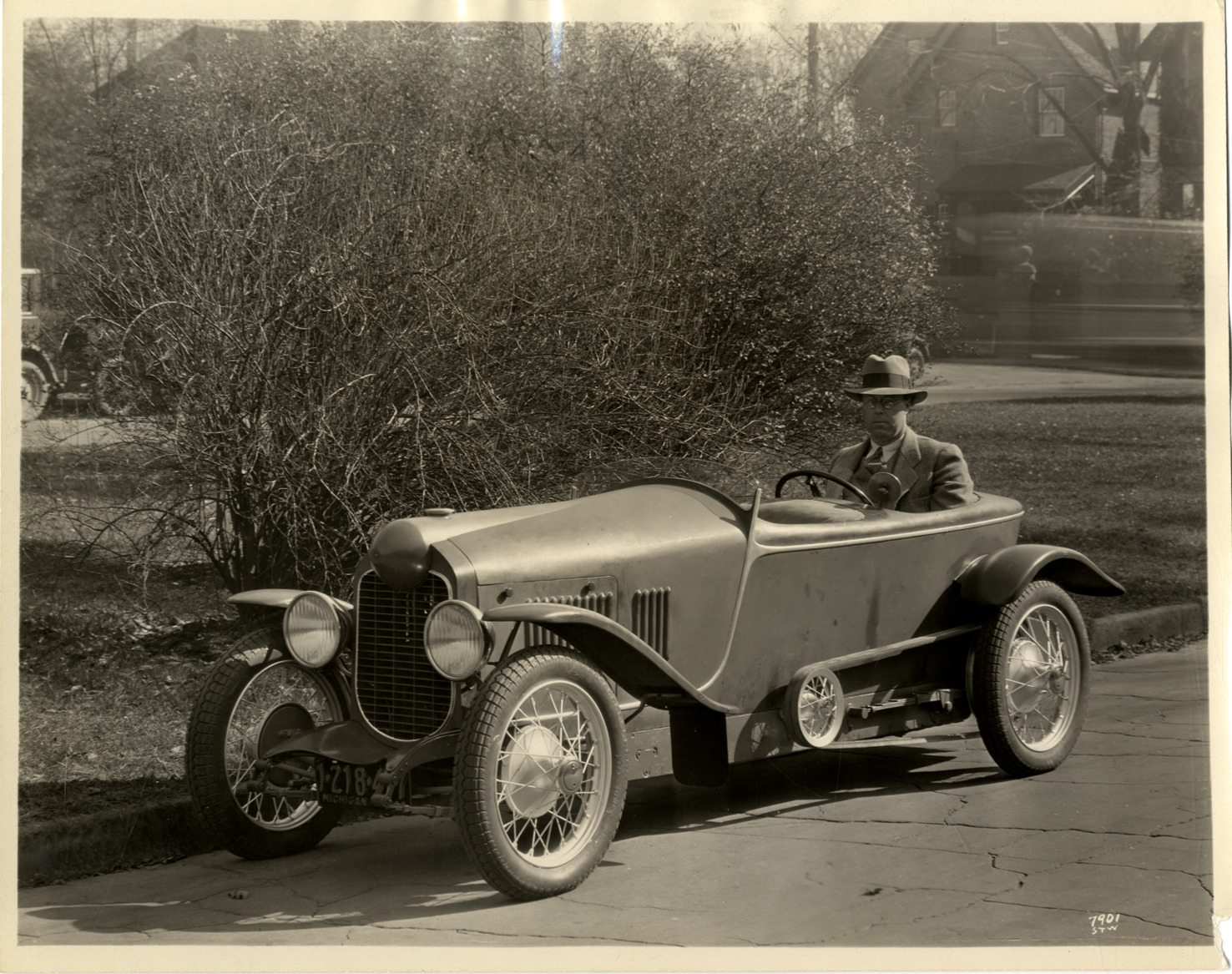 View of James Scripps Booth posing in a Da Vinci "Pup" cyclecar, designed by James Scripps Booth. Typed on back: "Subject: Da Vinci 'Pup,' 1929. Collection: MS10/James Scripps Booth Collection. Date: 1929. Location: Indian Village, Detroit, Mich. Photographer: Spencer & Wyckoff, photographers, Detroit, Mich. Source: John M. Booth. I.D.: Designed 1921 by James S. Booth, built 1929. Three-quarter left front view, with JSB at wheel."