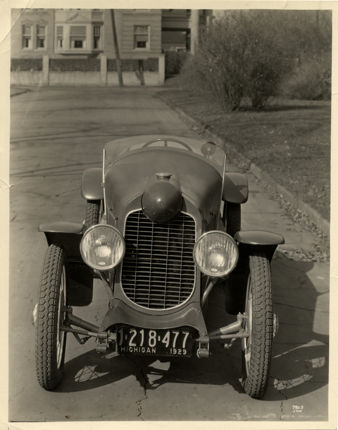 View of a Da Vinci "Pup" cyclecar, designed by James Scripps Booth. Typed on back: "Subject: Da Vinci 'Pup,' 1929. Collection: MS10/James Scripps Booth Collection. Date: 1929. Location: Indian Village, Detroit, Mich. Photographer: Spencer & Wyckoff, photographers, Detroit, Mich. Source: John M. Booth. I.D.: Designed 1921 by James S. Booth, built 1929. Front view."