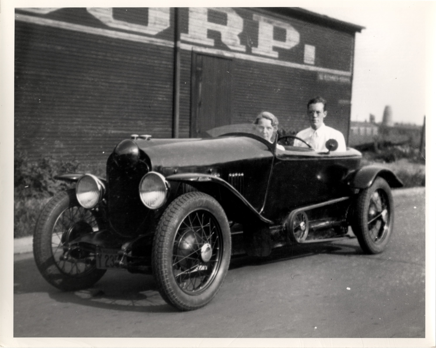 View of John M. Booth and Ellen Norlen in a Da Vinci "Pup" cyclecar, designed by James Scripps Booth. Typed on back: "Subject: Da Vinci 'Pup,' 1929. Collection: MS10/James Scripps Booth Collection. Date: 1934. Location: Detroit, Mich. (at Terminal Avenue shop?) Source: John M. Booth. I.D.: Ellen Norlen and John M. Booth in car. Car designed 1921, built 1929, by James S. Booth. Three-quarter left front view."