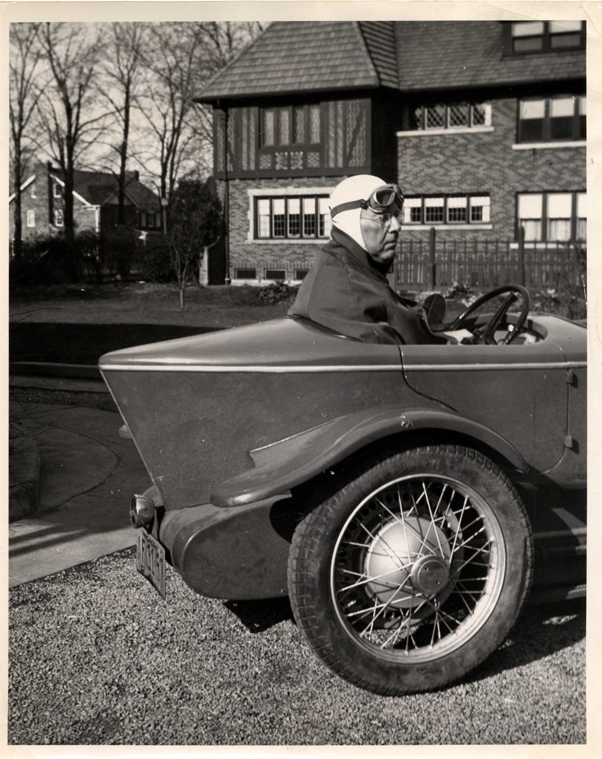 Close-up view of James Scripps Booth driving a Da Vinci "Pup" cyclecar, designed by James Scripps Booth. Typed on back: "Subject: Da Vinci 'Pup,' 1929. Collection: MS10/James Scripps Booth Collection. Date: Sept. 1952. Location: Sun House, Norwalk, Conn. Source: John M. Booth. I.D.: James S. Booth at wheel. Designed 1921, built 1929 by James S. Booth." Handwritten on back: "James Scripps Booth. Sun House, Silvermine, Norwalk, Conn. seated in 'Da Vinci Pup' cyclecar designed and built by Booth, 1929. Sept. 1952."