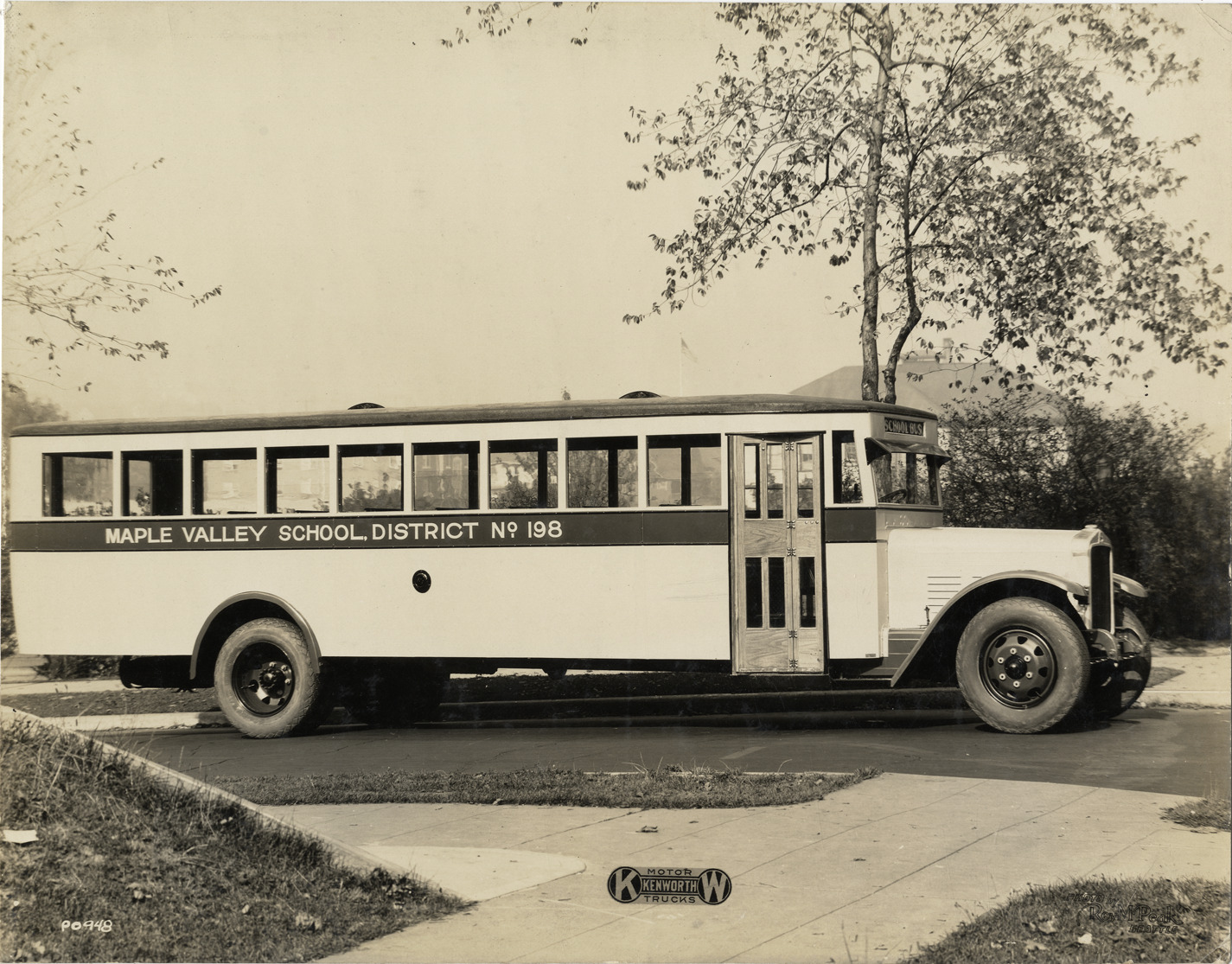 View of a Kenworth school bus for the Maple Valley School District no. 198. Printed on front: "Kenworth motor trucks." Stamped on back: "Roy M. Peak, photography. Main 8585. 412 Nat'l Bank of Commerce Bldg., Seattle, Wash."