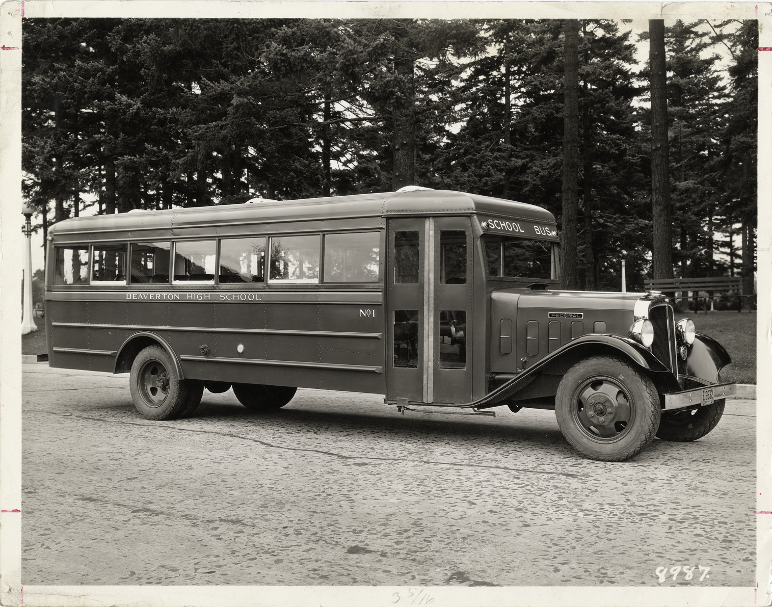 View of a Federal school bus with Heiser body for Beaverton High School. Label on back: "Here is a 2-2 1/2 ton special long wheelbase Federal chassis with an all-steel body that accommodates 50 high school students. Body built by Heiser, Seattle, Wash."