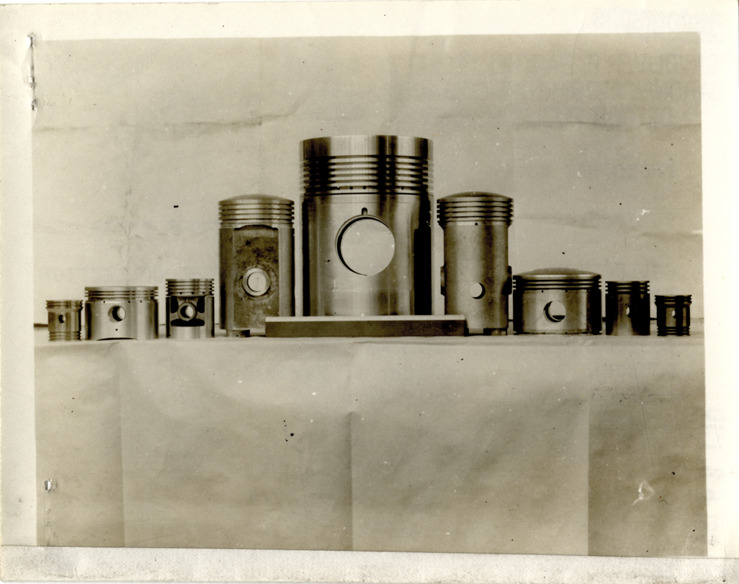 View of several automobile cylinders. Typed on back: "Subject: Automobiles--Component parts. Collection: MS16/Oliver E. Barthel Collection. Date: Undated. Location: Unknown. Photographer: Unknown. Source: Oliver E. Barthel. I.D.: Cylinders."
