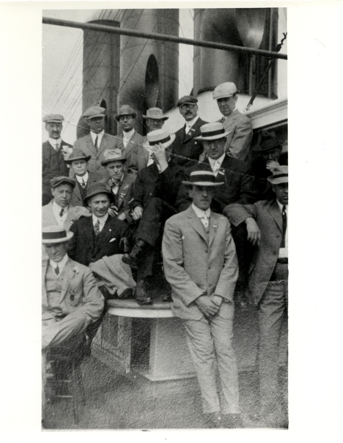 Group portrait of Oliver E. Barthel and unidentified men on boat. Typed on back: "Subject: Biography--Barthel, Oliver E. Collection: MS16/Oliver E. Barthel Collection. Date: Undated. Location: Detroit, Michigan. Photographer: Unknown. Source: Oliver E. Barthel. I.D.: The Mermaids, Oliver Barthel, front row, center."