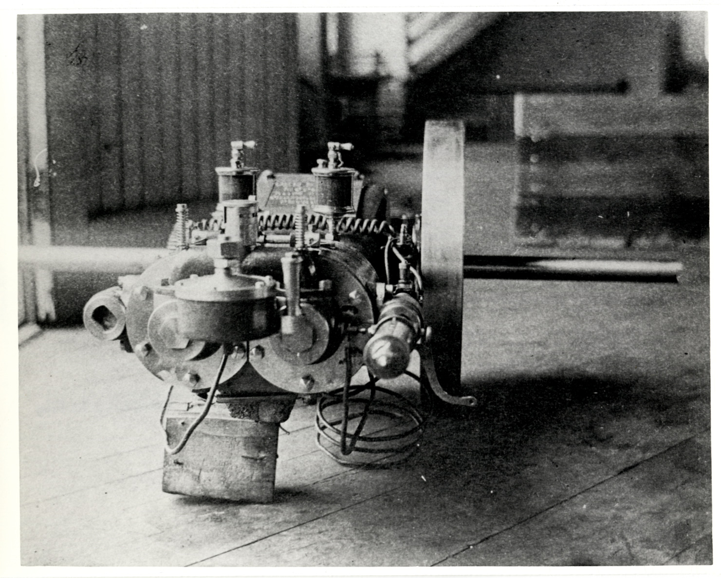 View of a King engine, designed by Charles Brady King. Typed on back: "Subject: Engines--King. Collection: MS16/Oliver E. Barthel Collection. Date: c.1894. Location: Detroit, Michigan. Photographer: Unknown. Source: Oliver E. Barthel. I.D.: Charles B. King engine, two-cycle that was in King's second car which was sold to the John Robinson Circus."