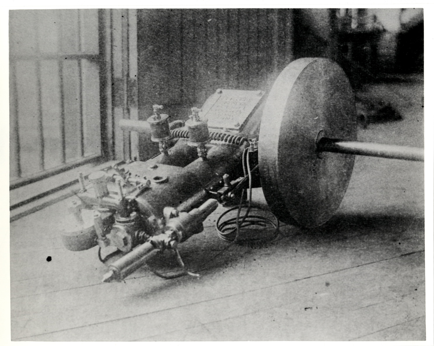 View of a King engine, designed by Charles Brady King. Typed on back: "Subject: Engines--King. Collection: MS16/Oliver E. Barthel Collection. Date: c.1894. Location: Detroit, Michigan. Photographer: Unknown. Source: Oliver E. Barthel. I.D.: Charles B. King engine, two-cycle engine that was in King's second car which was bought by the John Robinson Circus."