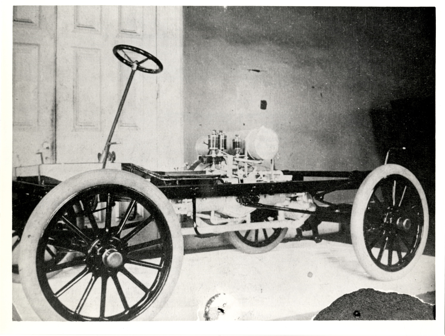 View of a King automobile chassis, designed by Charles Brady King. Handwritten on back: "Subject: King automobile. Collection: MS16/Oliver E. Barthel Collection. Date: Undated. Location: Unknown. Photographer: Unknown. Source: Oliver E. Barthel. I.D.: Charles B. King automobile."