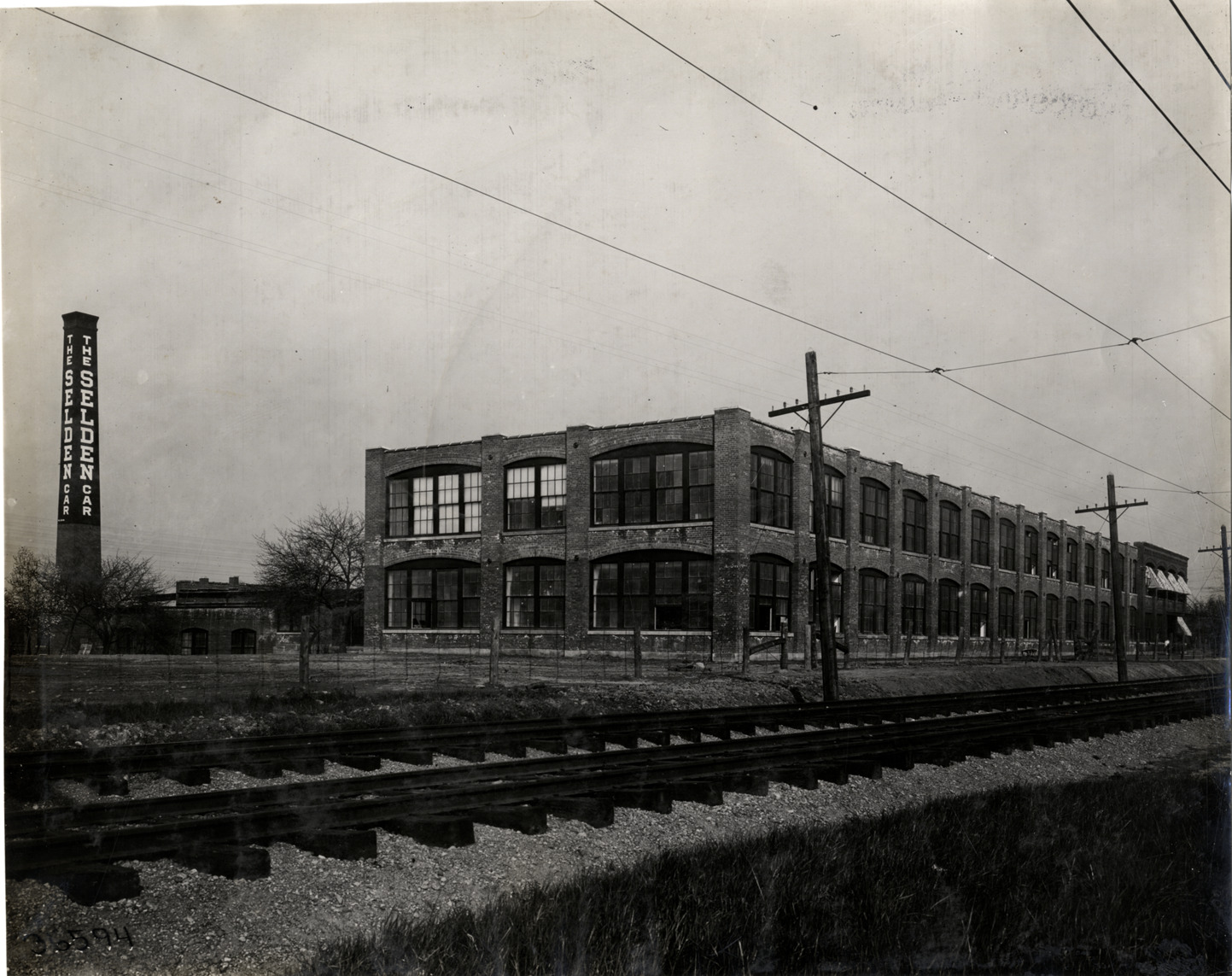 View of Selden Motor Vehicle Company factory; railroad tracks in foreground. "The Selden car" is painted on industrial smokestack. Stamped on back: "Spooner & Wells, Inc., photographers, telephones 3472-3473 Columbus, 1931 Broadway, New York." Handwritten on back: "Factories--Selden M.V. Co., ca. 1910."