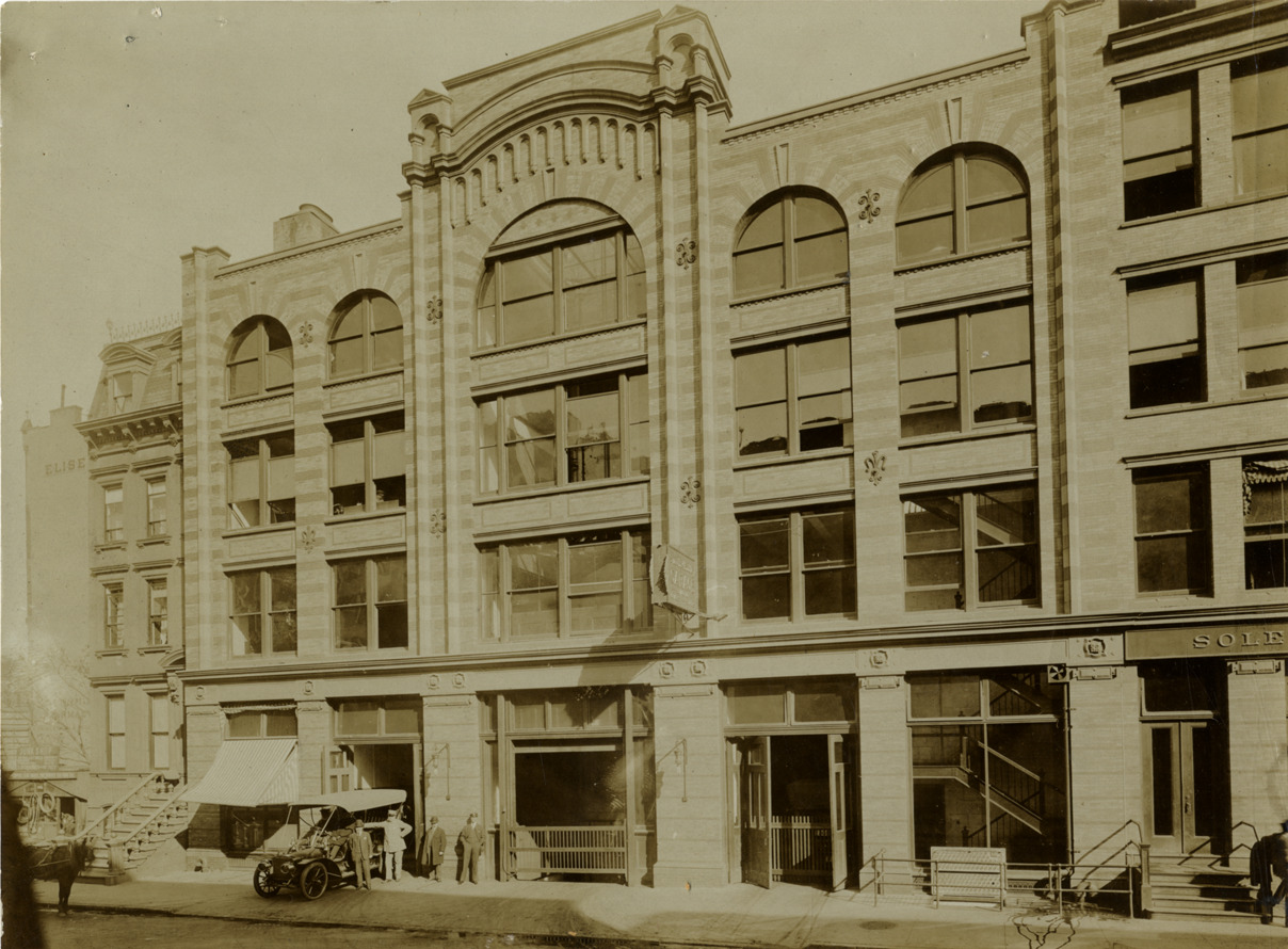 View of men posing with a car in front of the Smith & Mabley Manufacturing Company garage. Handwritten on back: "Our garage on 56th bet. B'way & [undecipherable]. Where you can best be taken care of this side of the Atlantic and east of the Pacific. It connects with our great salesroom opening out on B'way. GT's elevator with turntable. Factories--Smith & Mabley."