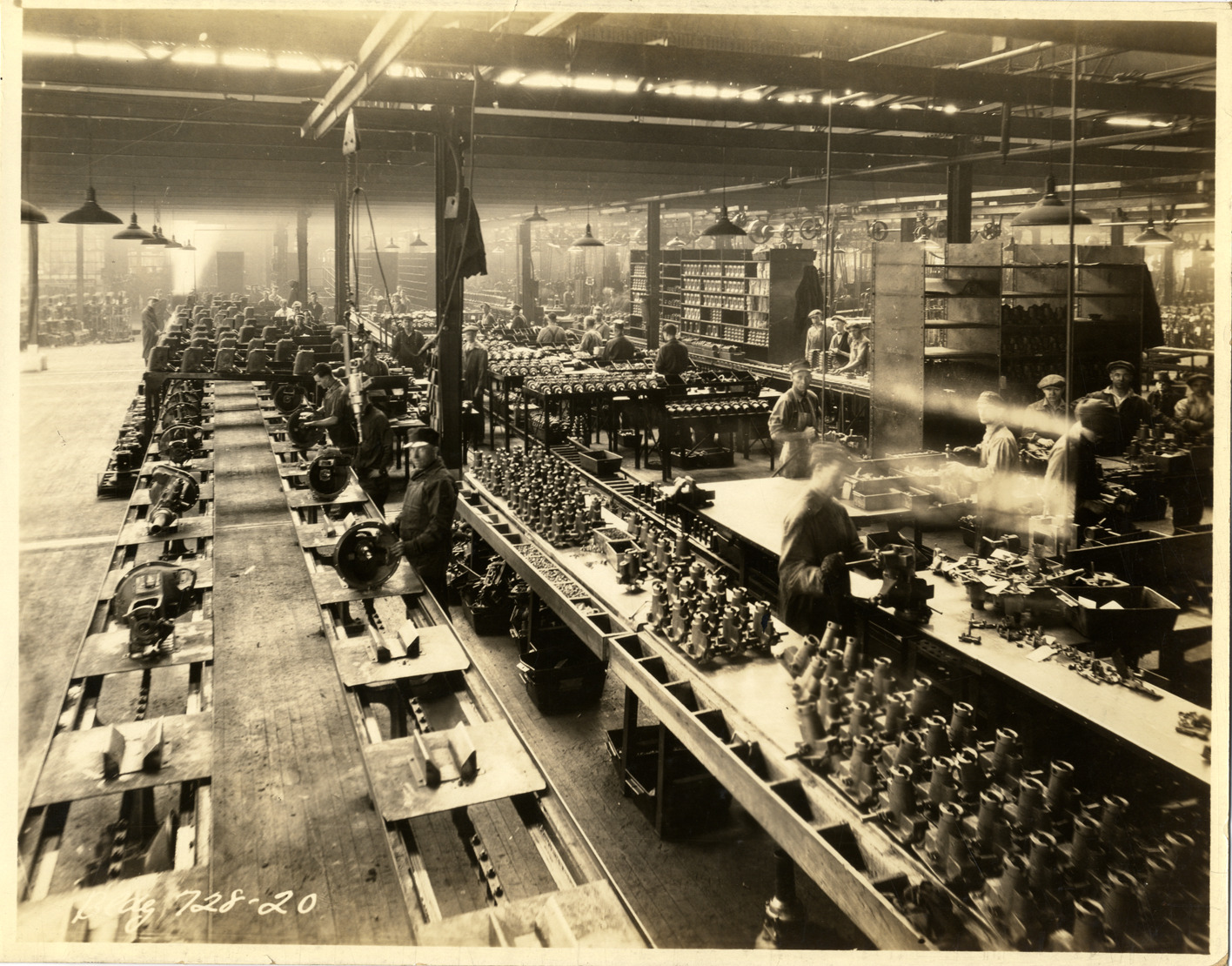 View of workers assembling transmissions in the Willys-Overland Company factory. Typed on back: "13. Progressive assembling of transmissions." Handwritten on back: "Factories--Willys-Overland."