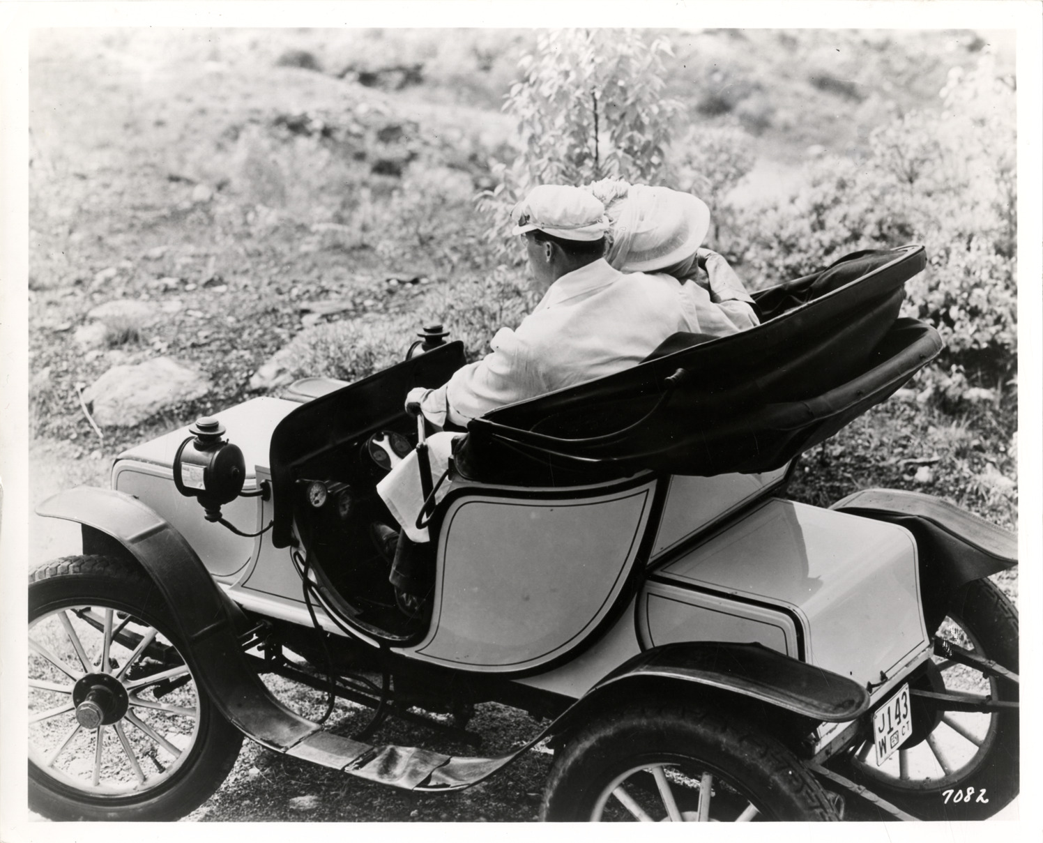 Man and woman in a 1908 Baker electric runabout