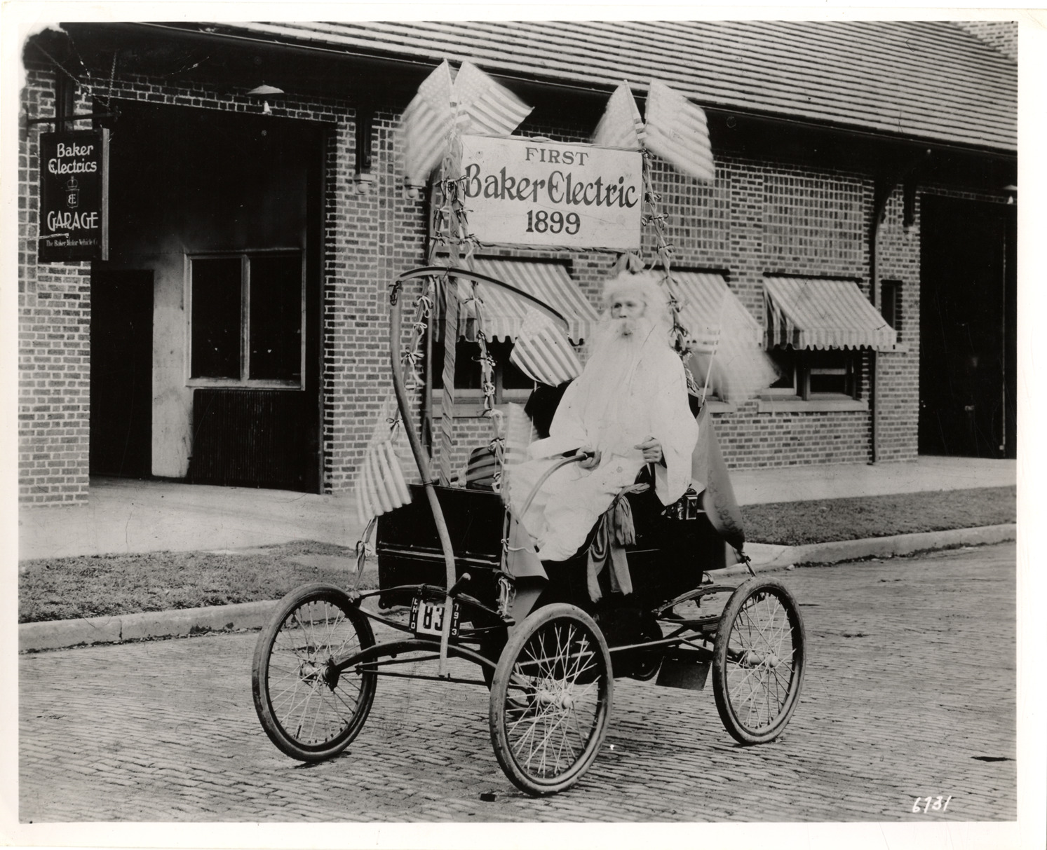 View of a motorist, costumed as an elderly man, posing in a 1899 Baker electric automobile. Car is decorated with American flags and sign reading "First Baker electric, 1899." Baker Electrics Garage in background. Typed on back: "Baker electric 1899." Handwritten on back: "The first Baker electric. Baker electric, 1899."