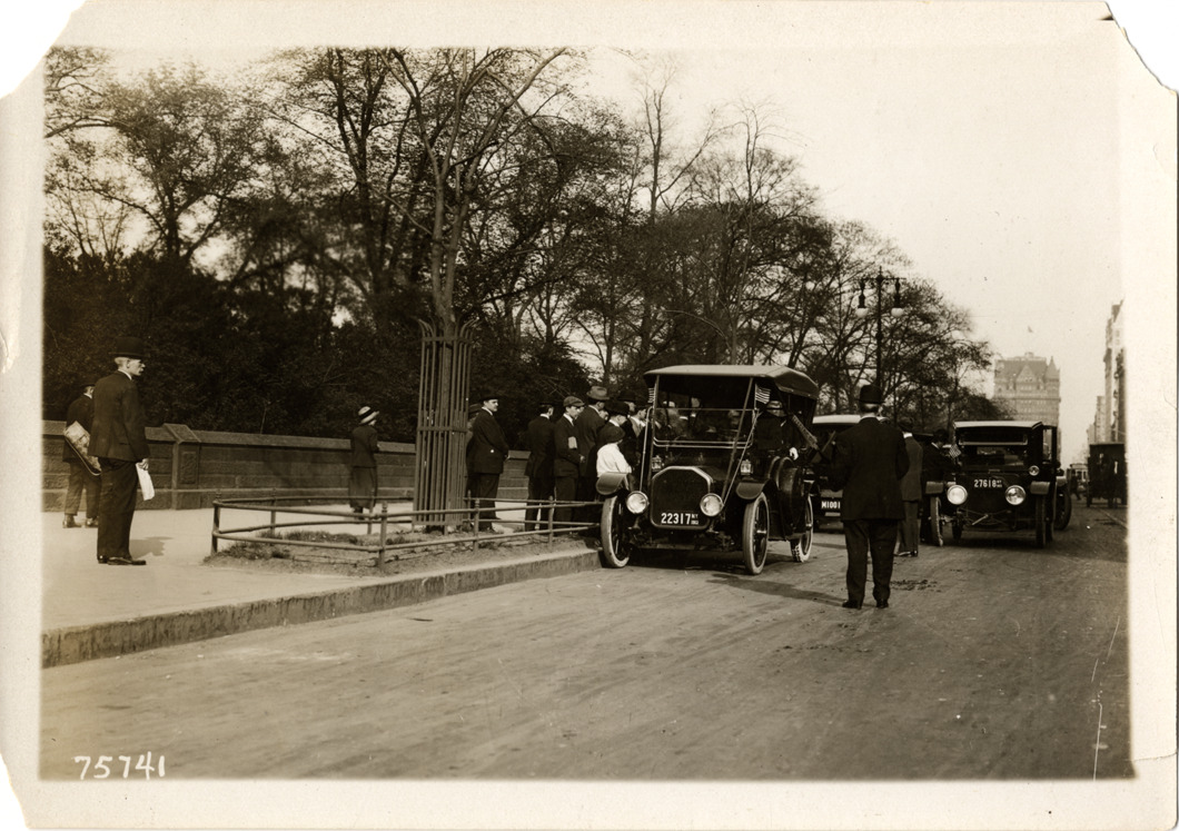 View of spectators on sidewalk, looking at a Baker electric car. Unidentified car and buildings in background. Stamped on back: "Spooner & Wells, Inc., photographers, 1931 Broadway, N.Y. City, phones 3472-3473 Col." Handwritten on back: "Baker el., c.1910."